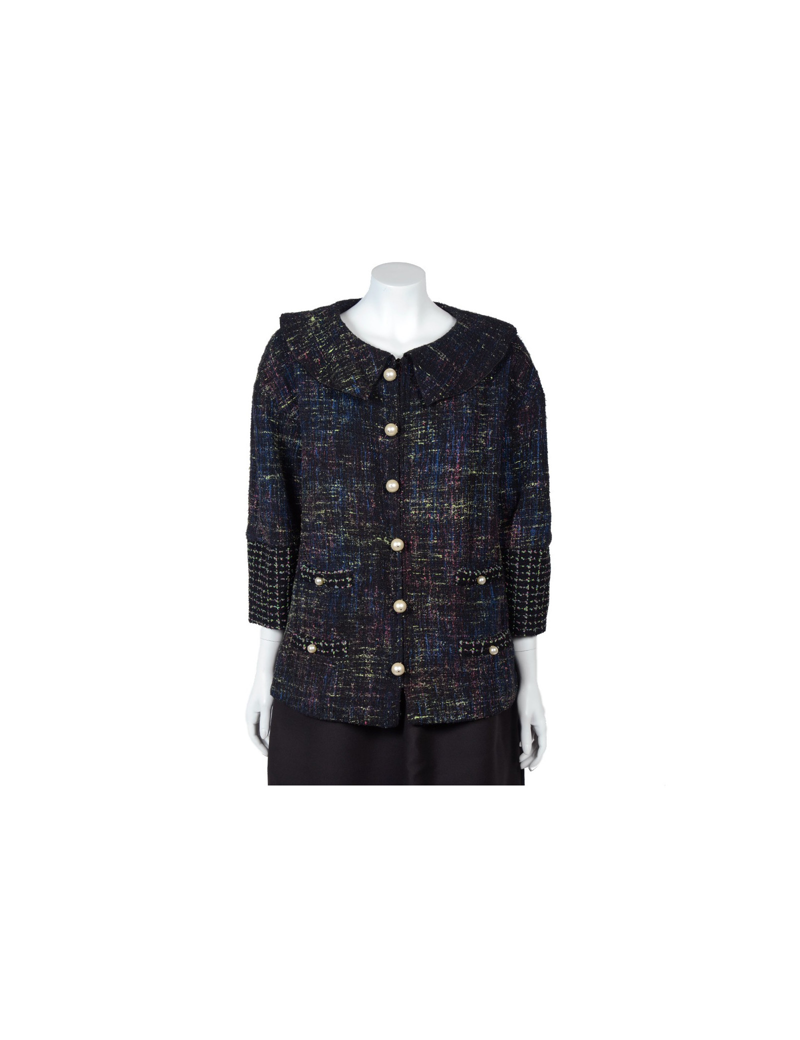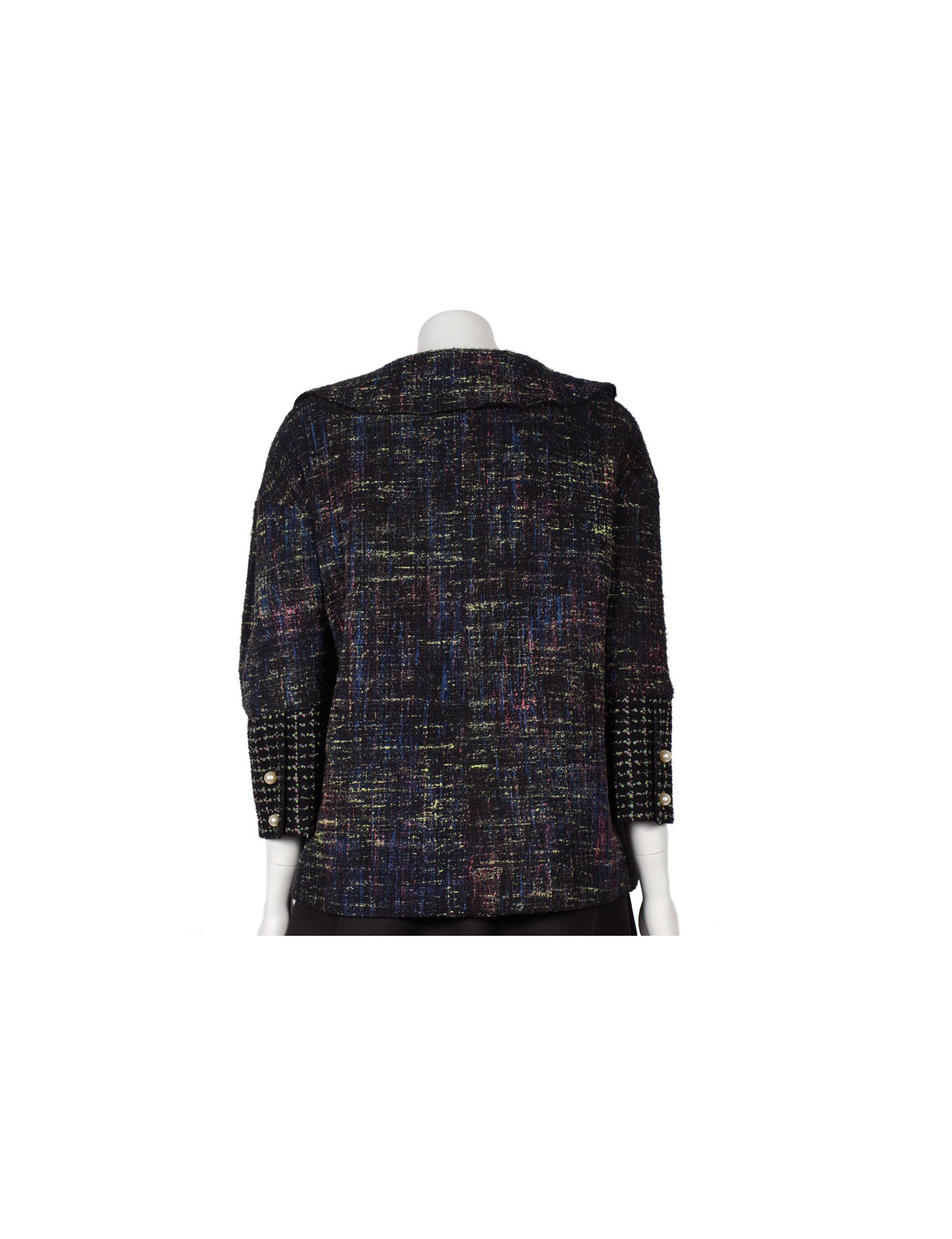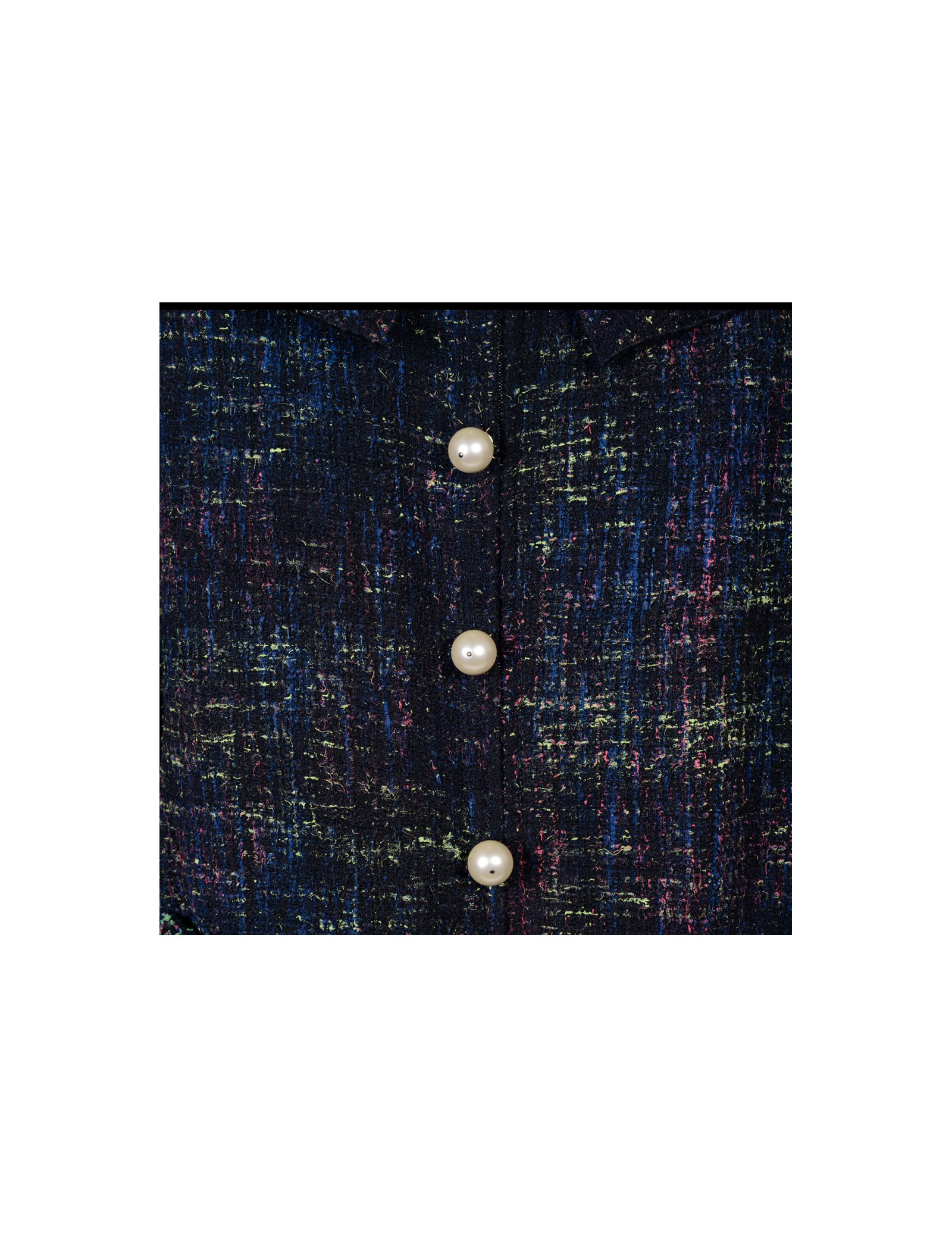 Superbe veste Chanel coupe trapèze en tweed et perles nacrées, collection été 2012, le tweed de la veste est de couleur vert, bleu et fushia sur fond noir. Il y a deux fausses poches de chaque coté de la veste, la fermeture principale est zippée, la veste comporte six faux boutons d'attaches en perles nacrées, les manches sont évasées au bas et comporte deux boutons en perles nacrées. Pas d'étiquette de taille/composition