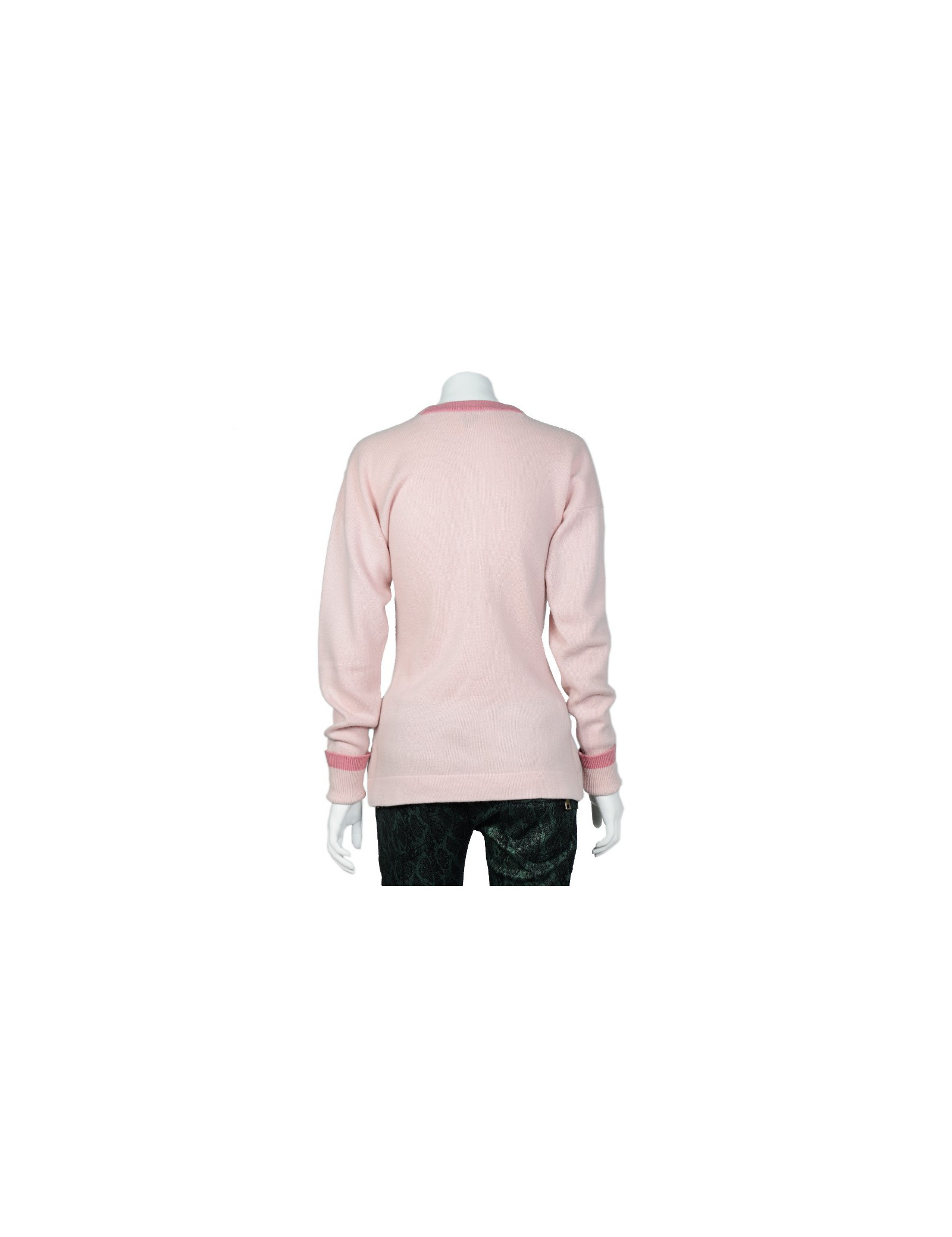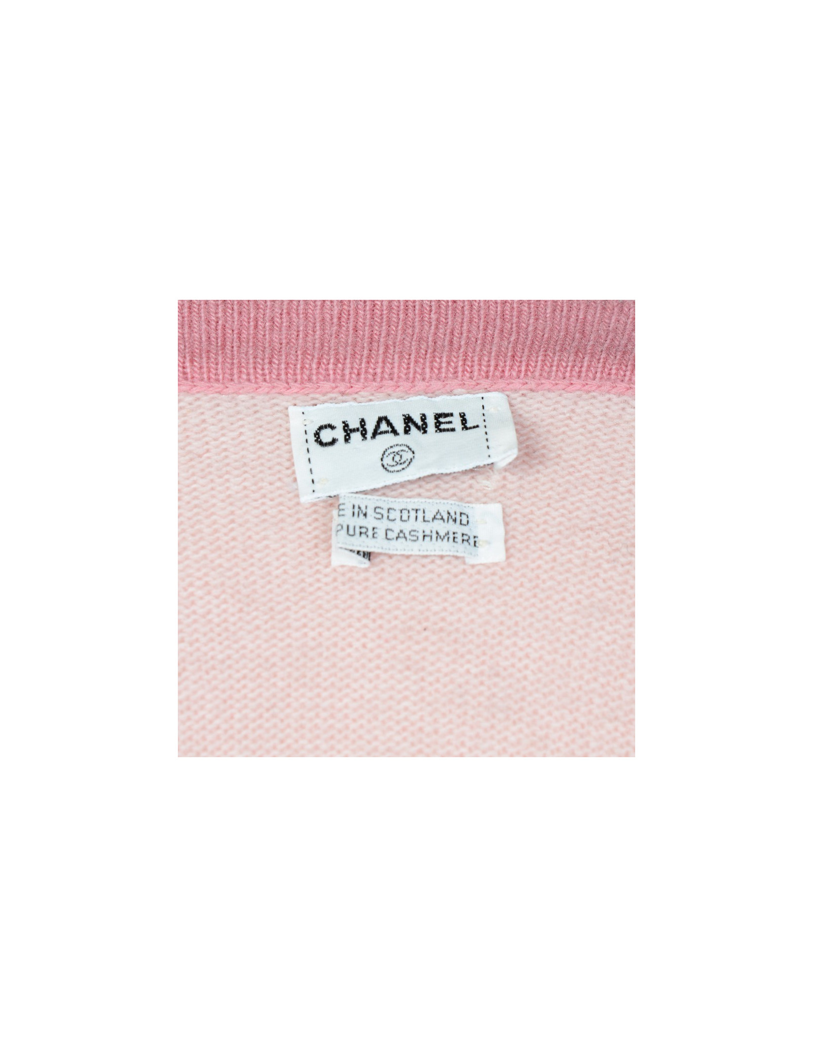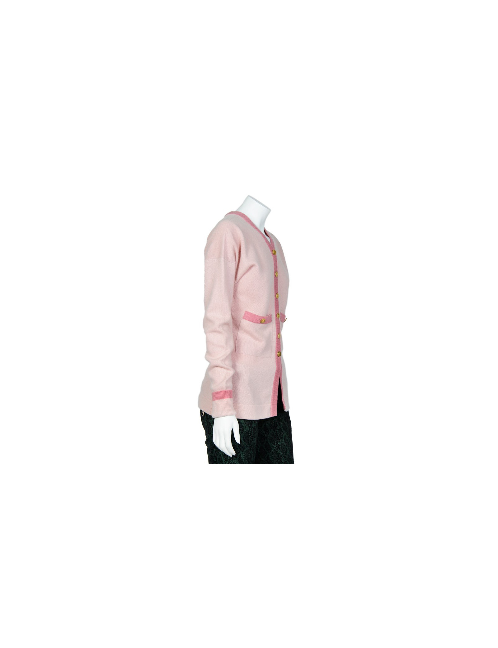 Cardigan Chanel vintage en cachemire rose. Pas d'étiquette de taille, équivaut à un 38. Fermeture 6 boutons couture dorés avec le sigle "CC" au centre. Il dispose de deux poches plaquées fermées par un bouton également. Les bordures sont de couleur rose pastel. En très bon état.