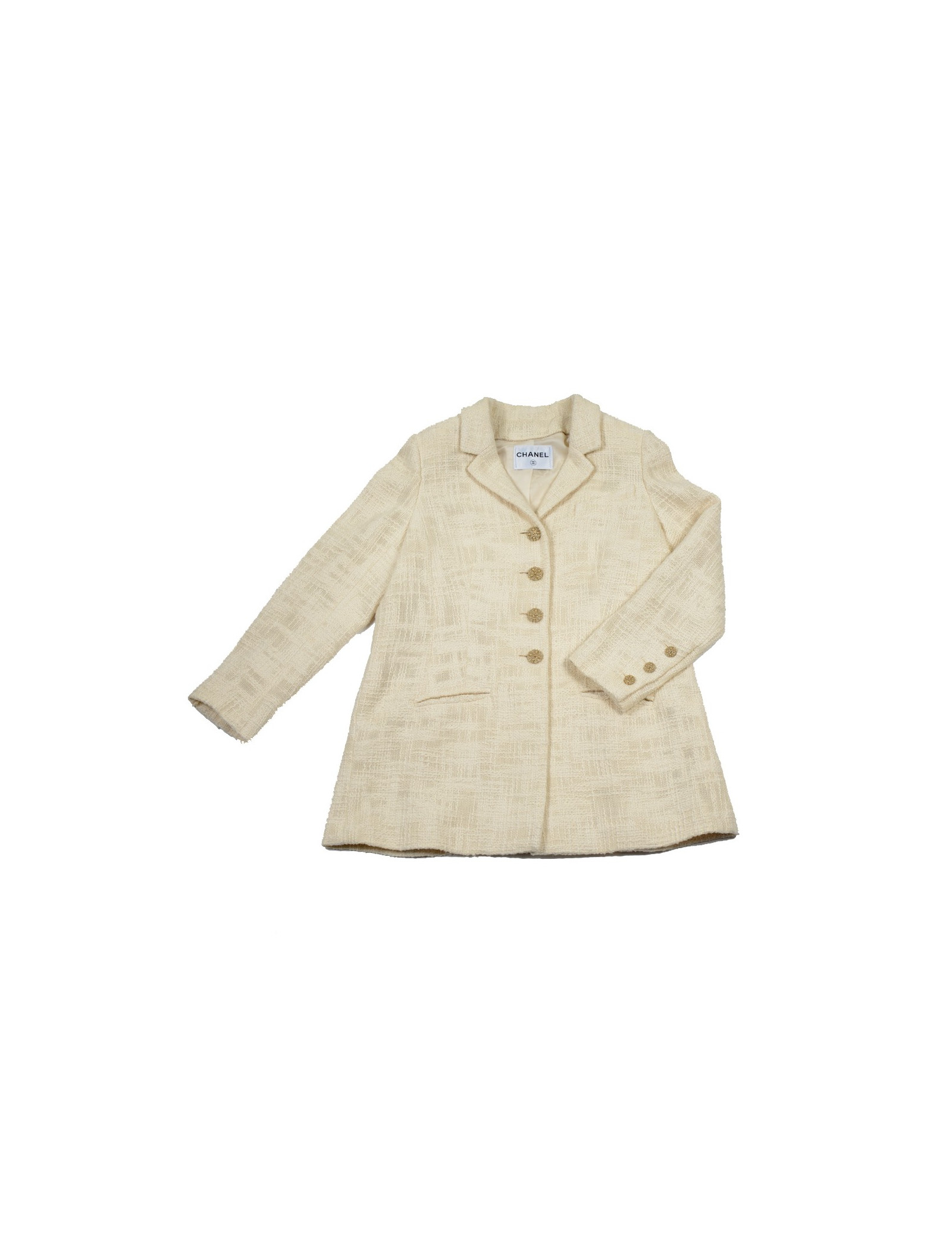 Belle veste longue en tweed de couleur ivoire Chanel en taille 38 (pas d'étiquette), en parfait état, issue de la célèbre collection Chanel Paris-Bombay. Elle est doublée de soie monogram de même couleur, entourée d'un fil or pâle. La veste longue Chanel se ferme par des magnifiques boutons bijoux.Il y a 3 poches passepoilées, une poche sur la poitrine et deux autres poches sur les hanches.