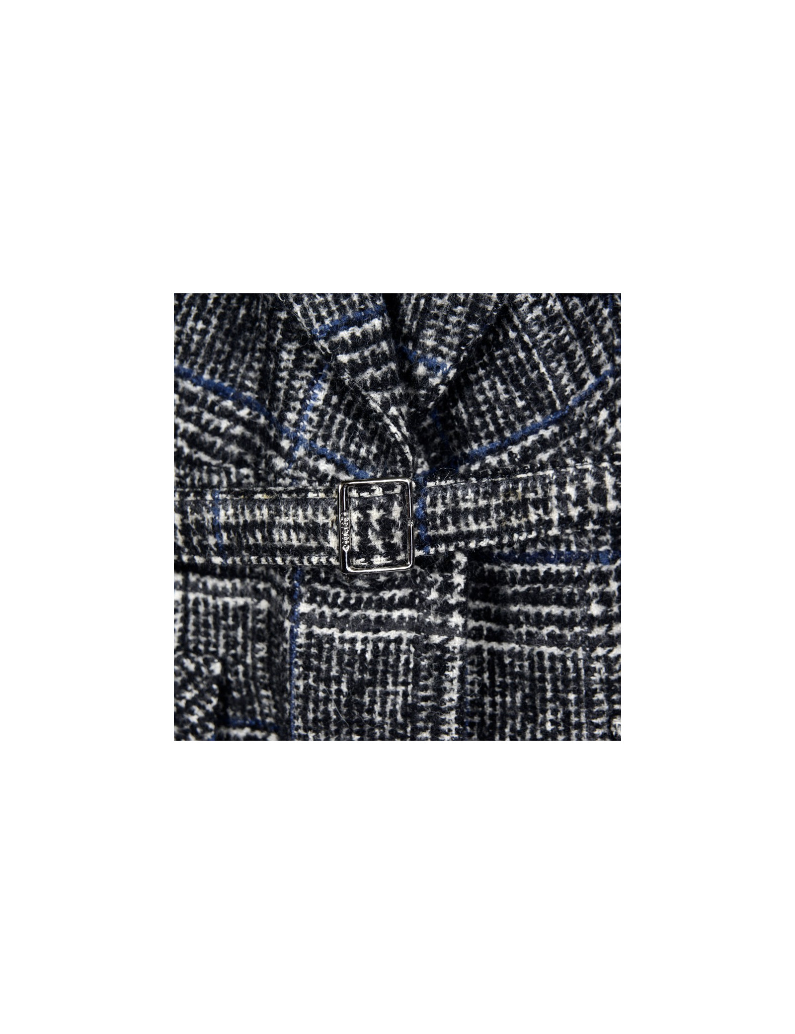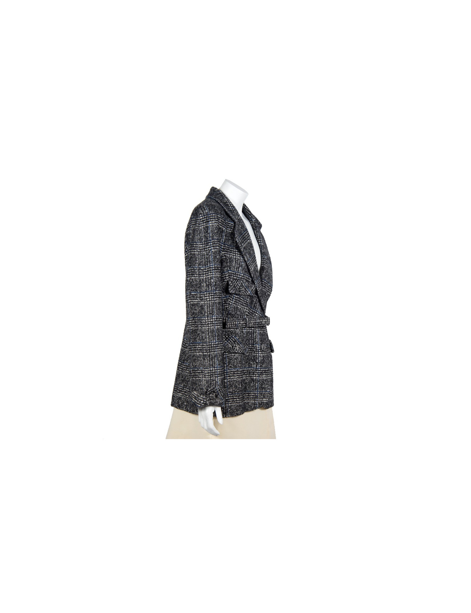 Mythique veste de la maison Chanel taille 46 issue du prêt-à-porter automne 2007. Elle est en tweed de couleur grise chinée . Elle se ferme par deux gros boutons en tweed et liseré doré. Une ceinture en tweed, intérieur cuir noir resserre la veste à la taille. Il y deux fausses poches sur le bas de la veste. La doublure est en soie noire et comporte sa chaînette. Légère fente au dos de la veste. Elle est en très bon état