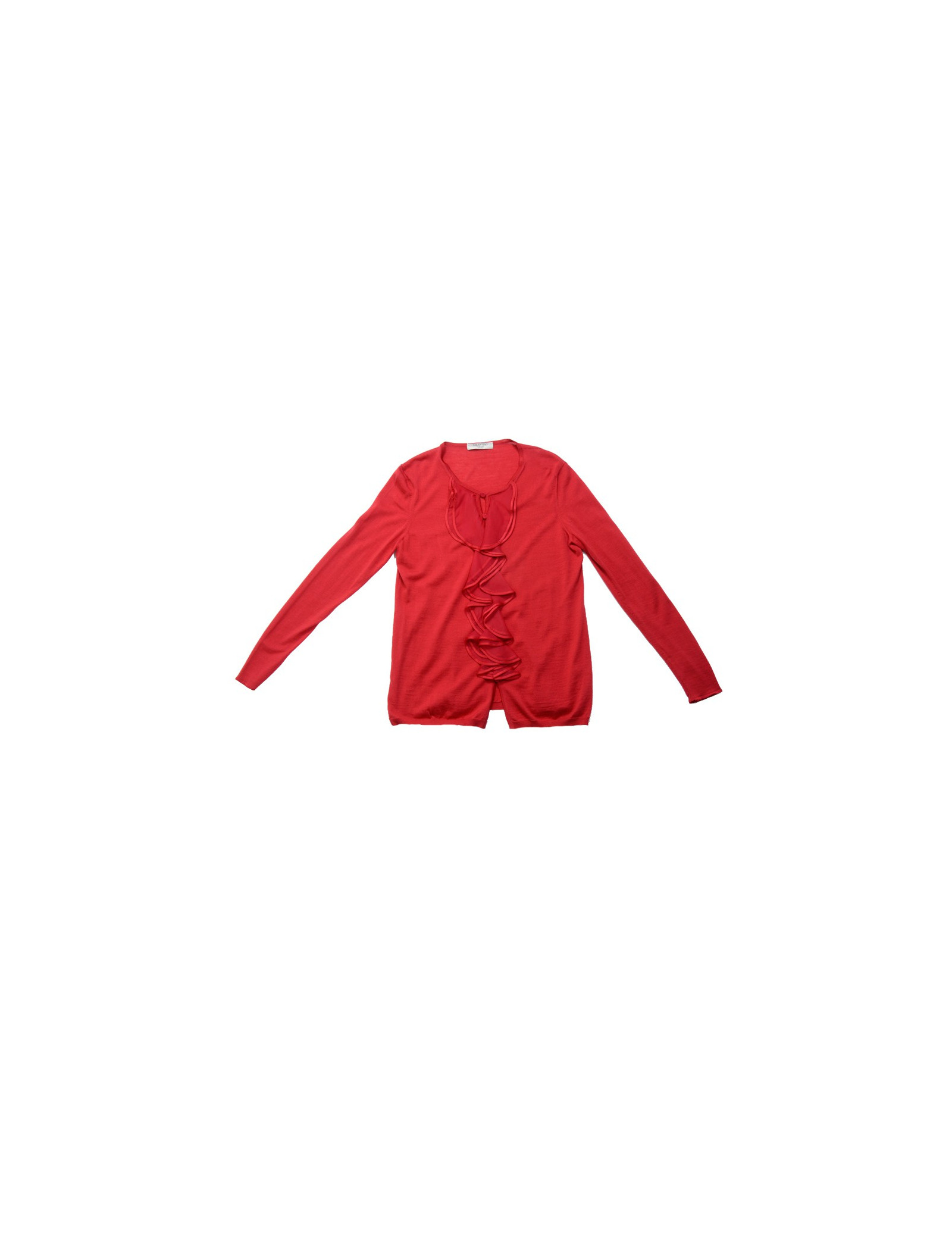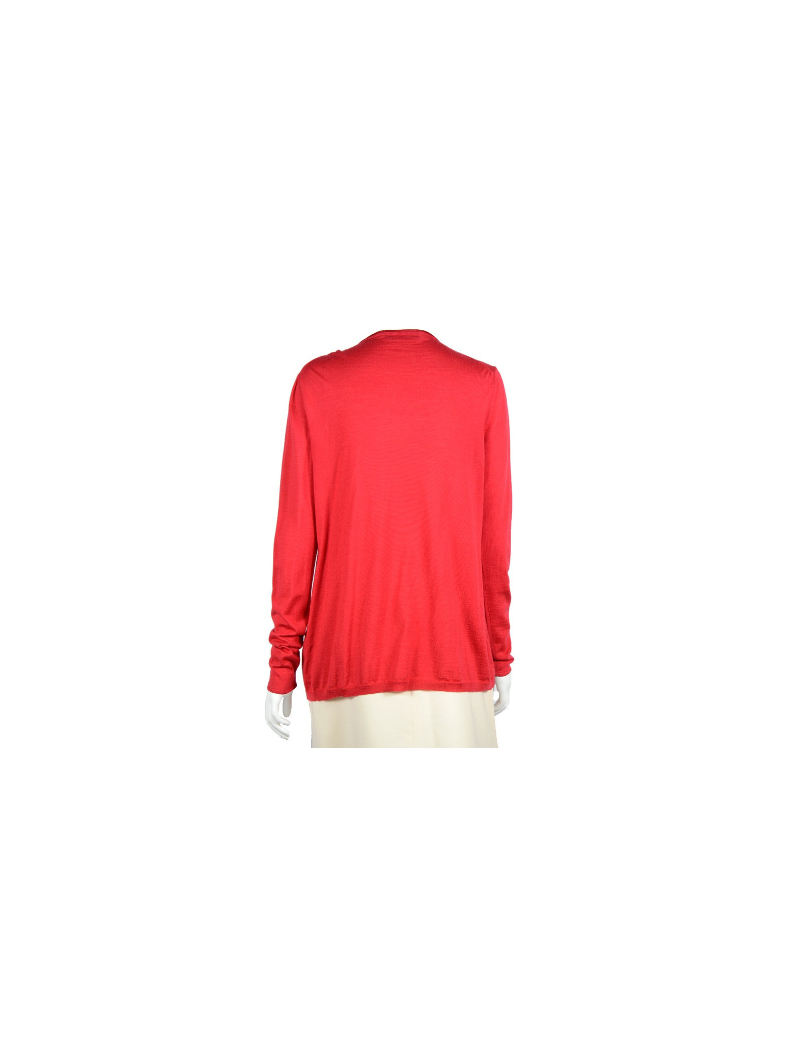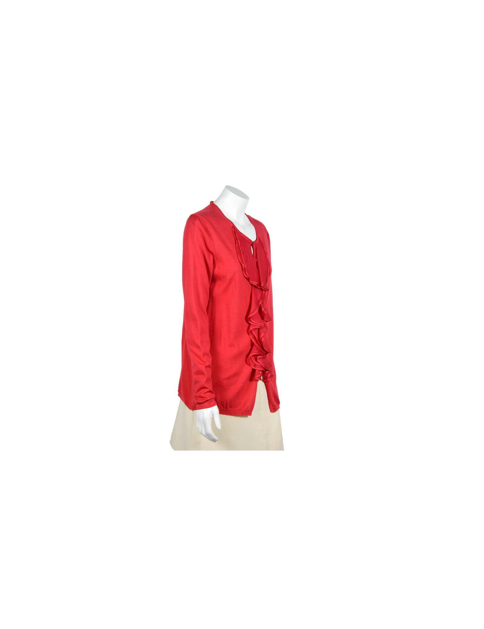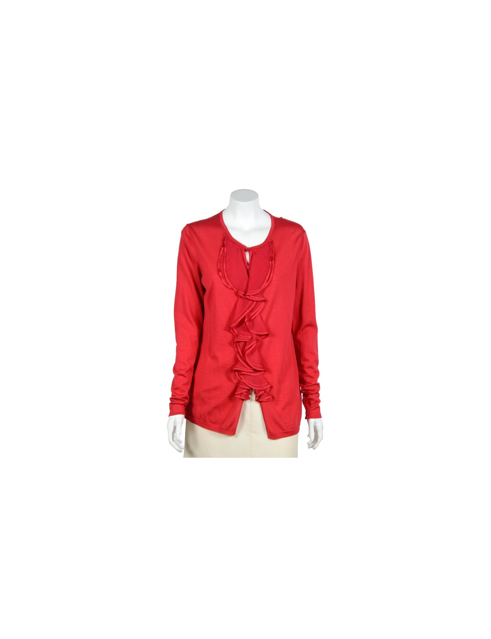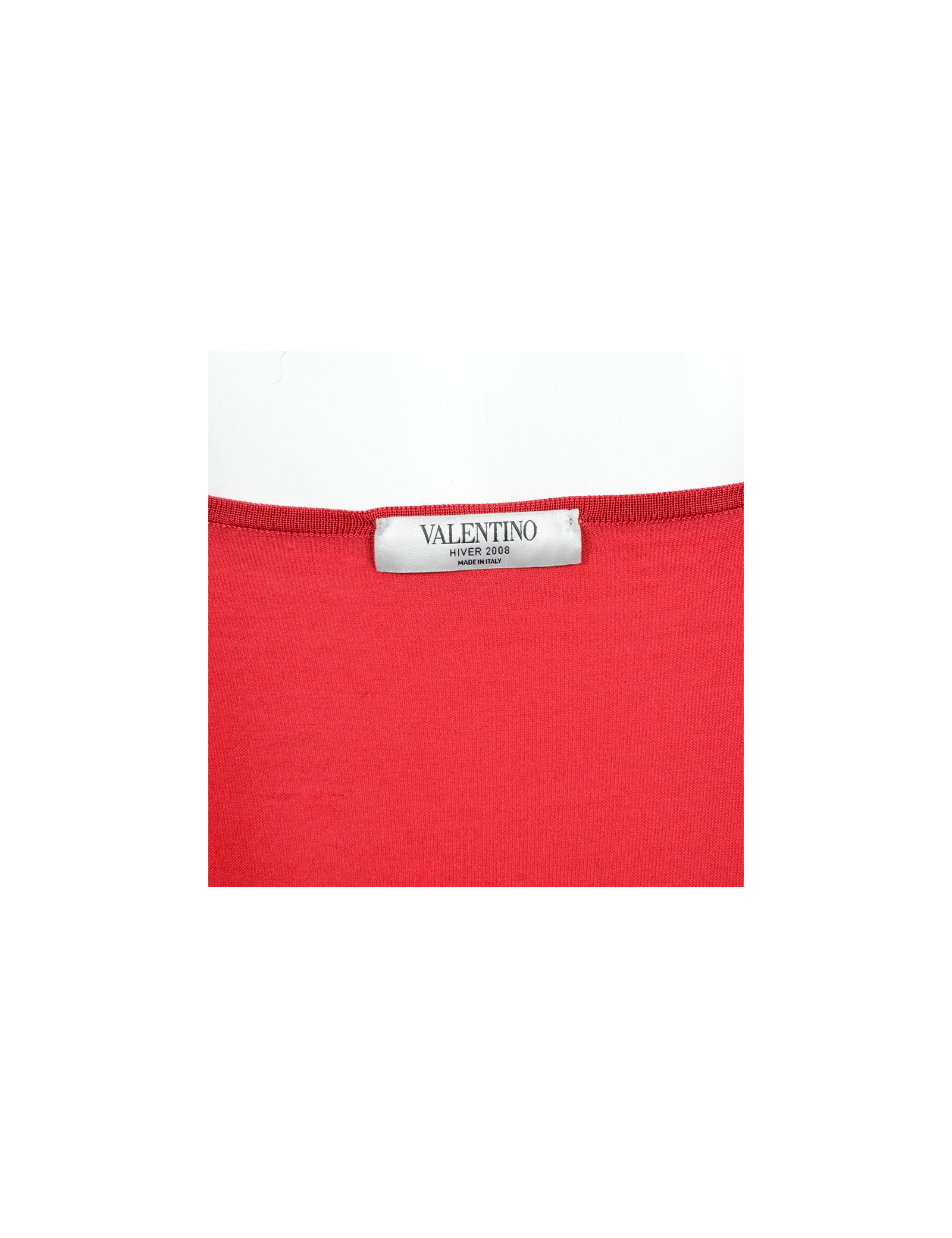Gilet Valentino en soie et laine rouge. Pas d'étiquette de taille, équivaut à un 40. Il se ferme par neuf petits boutons rouge dissimulés derrière des gondoles. (il y a une tâche sur le gilet). Il est en très bon état.