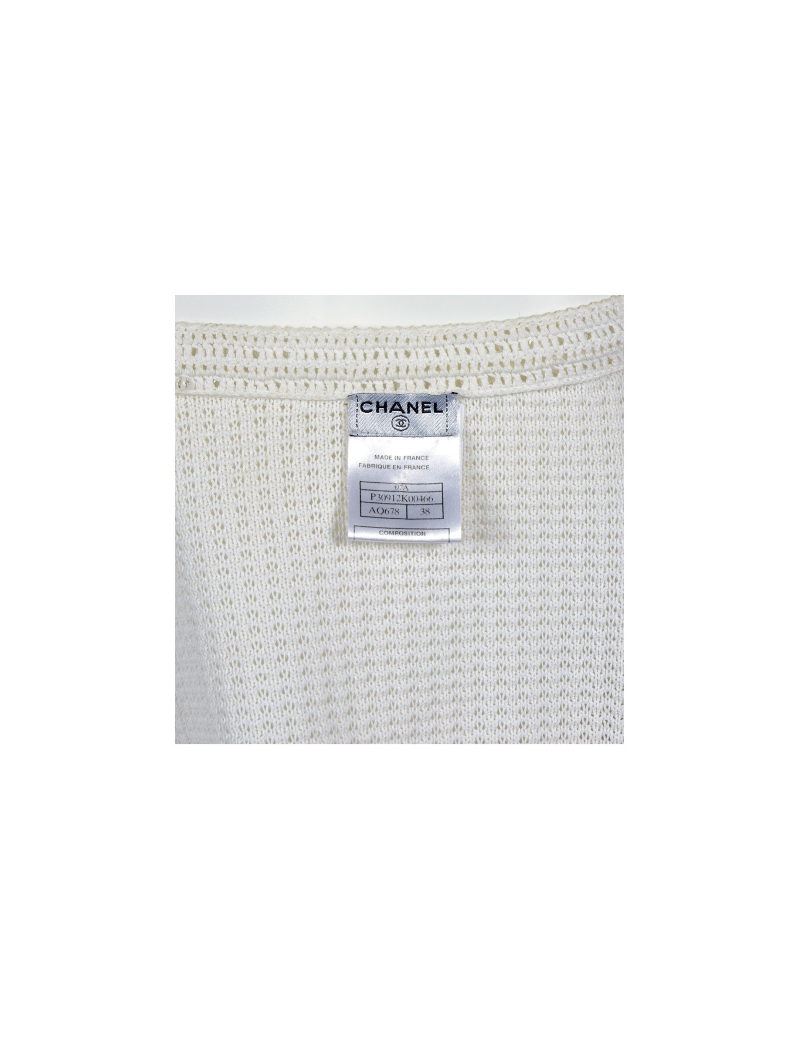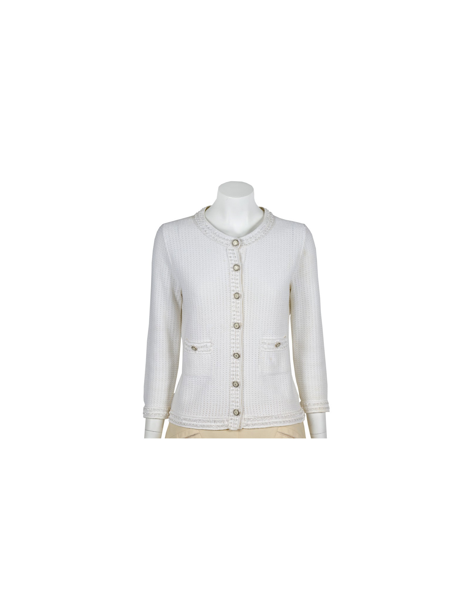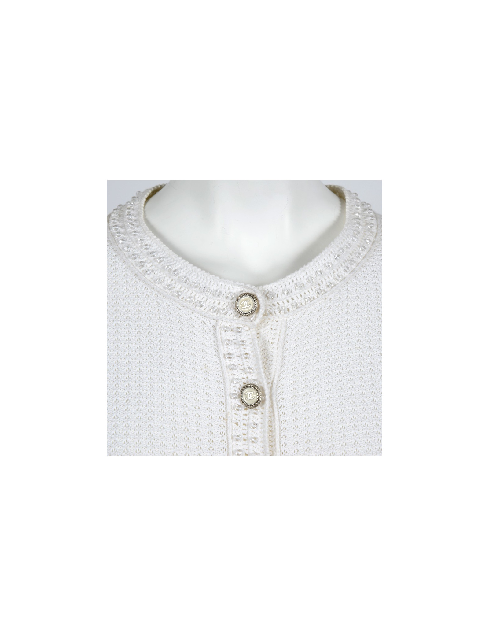 Charmant gilet Chanel, taille 38, issu du prêt-à-porter automne 2007, en coton écru avec un lizeret cousu par deux rangées de perles transparentes. Les boutons sont émaillés beiges et au centre un double C. Il y a deux poches devant. En très bon état.