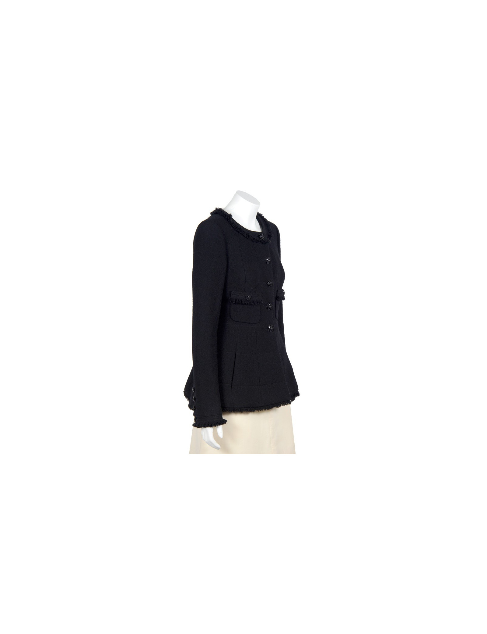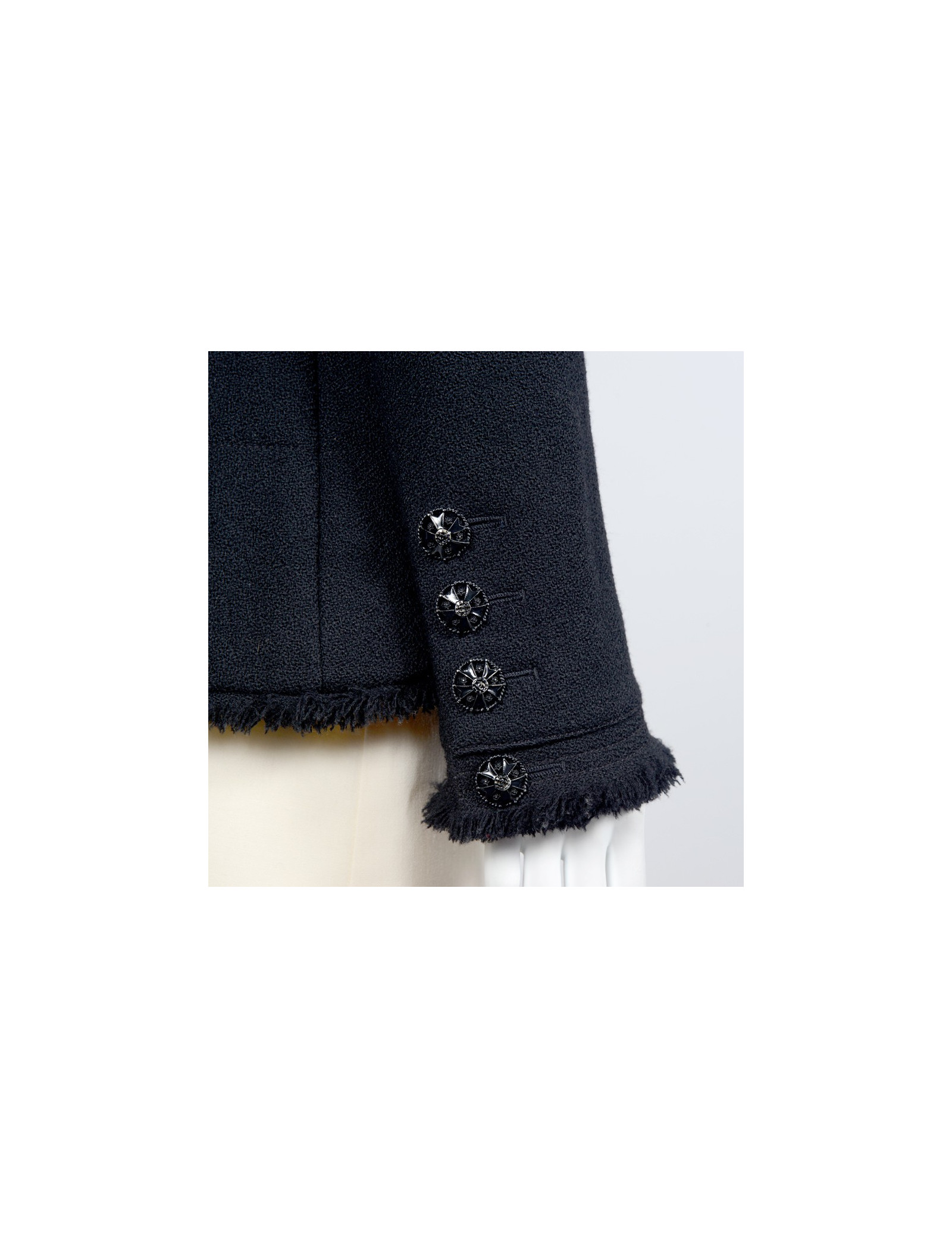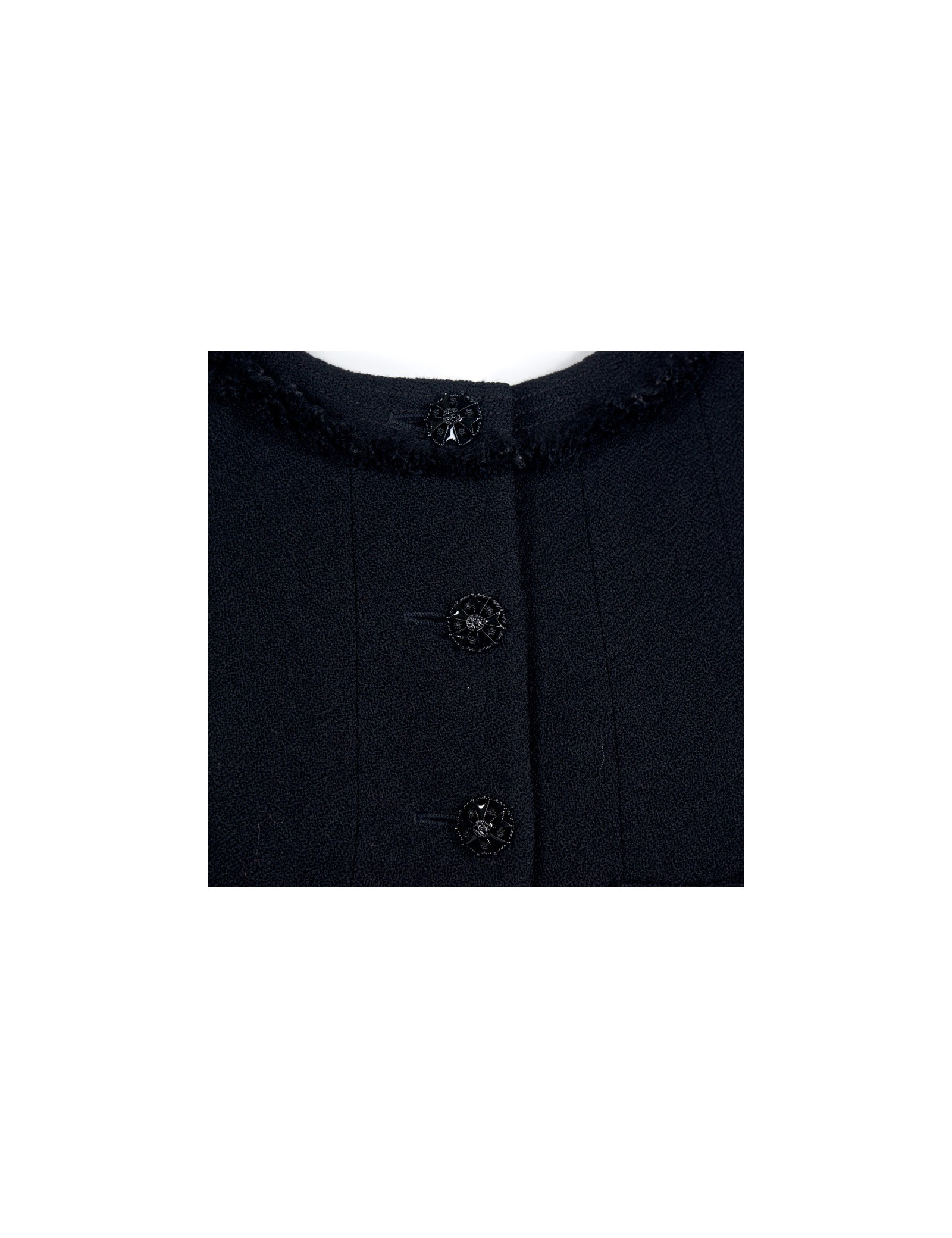 Veste Chanel T38 en tweed noir (100% laine), quatre jolis boutons bijoux noirs sur chaque manche et un à l'arrière rendent cette pièce extrèmement élégante. Légère usure sur certains boutons. En très bon état.