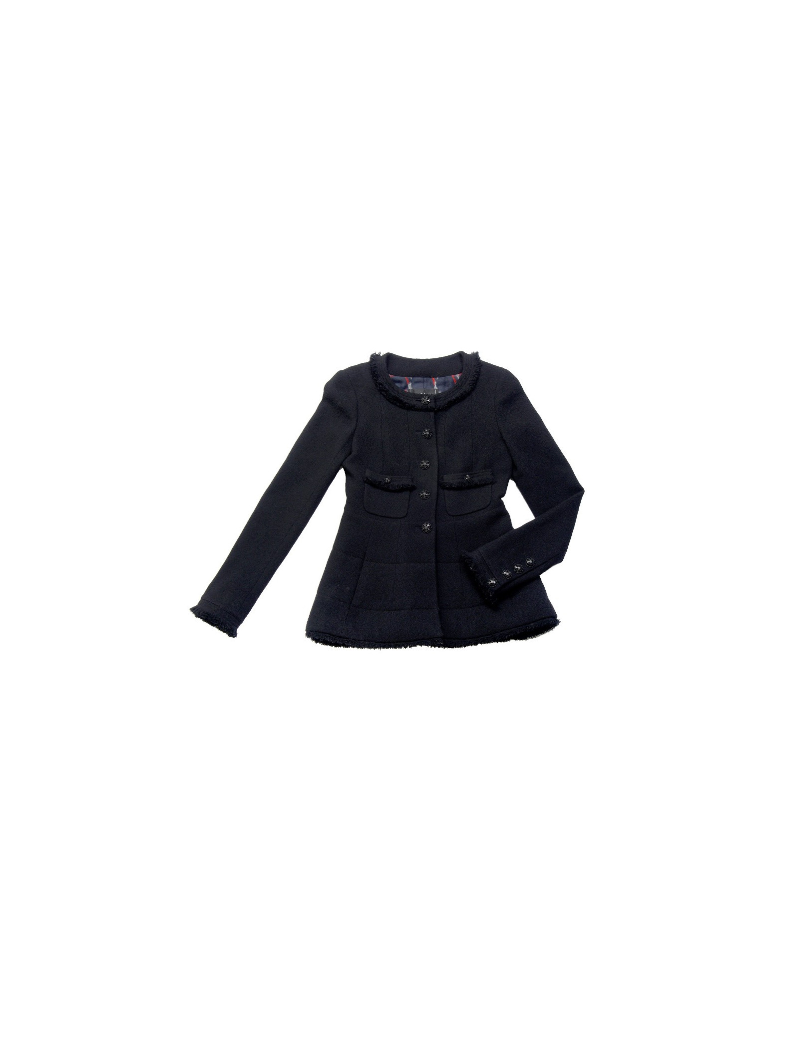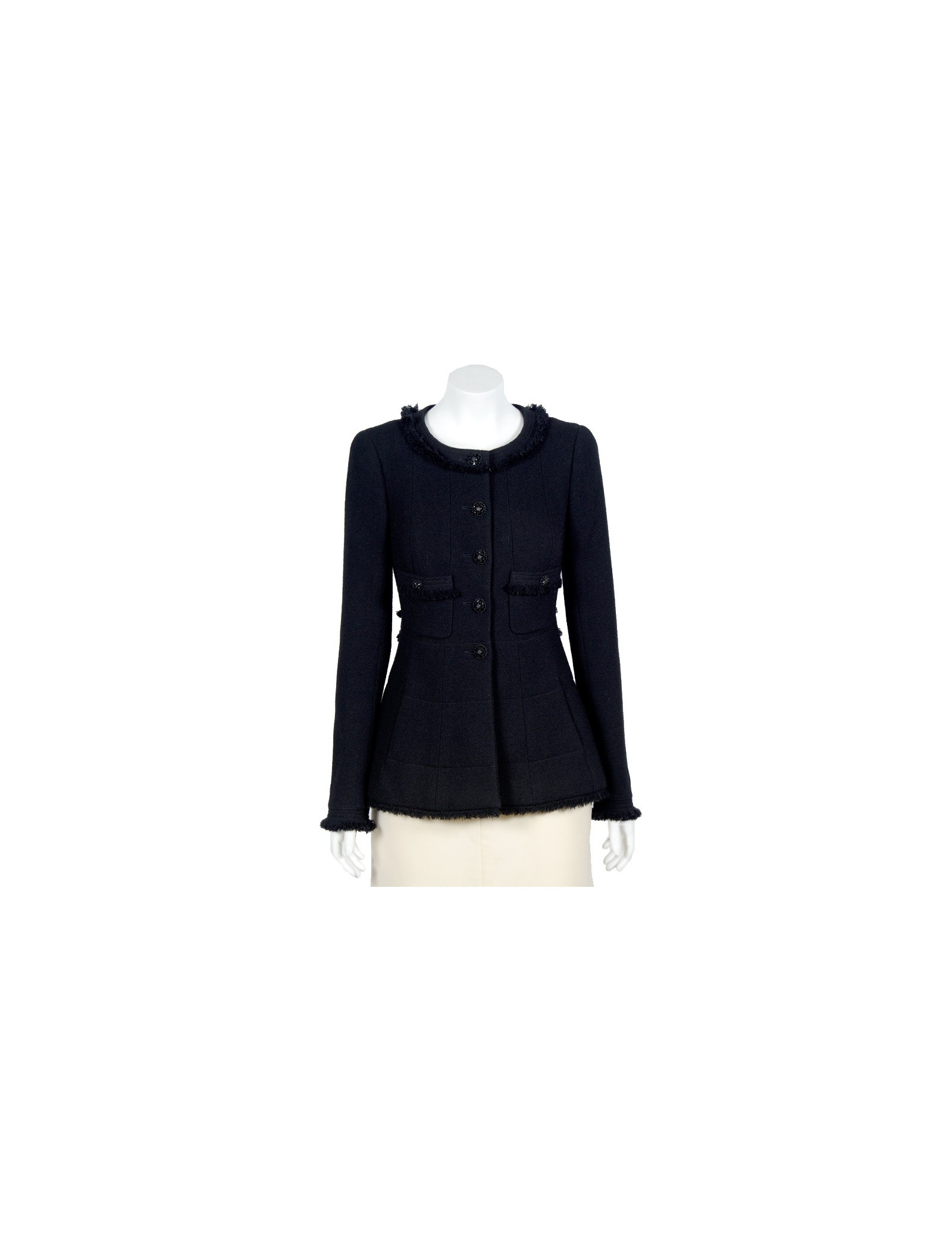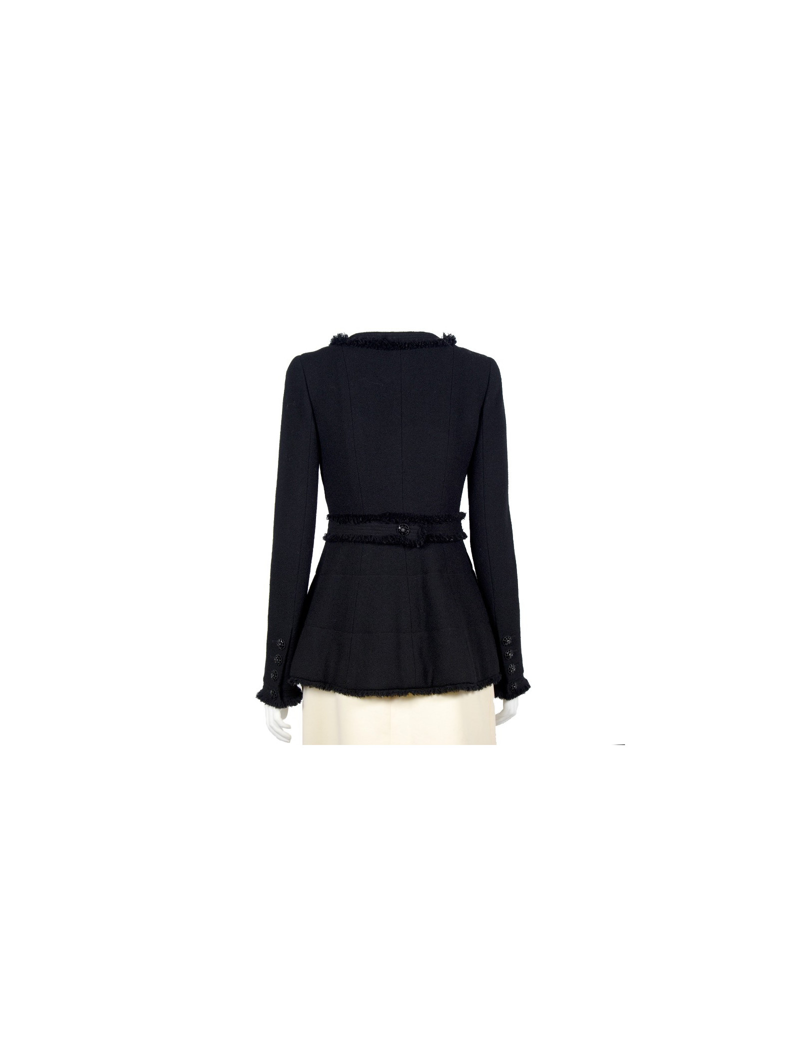 Veste Chanel T38 en tweed noir (100% laine), quatre jolis boutons bijoux noirs sur chaque manche et un à l'arrière rendent cette pièce extrèmement élégante. Légère usure sur certains boutons. En très bon état.