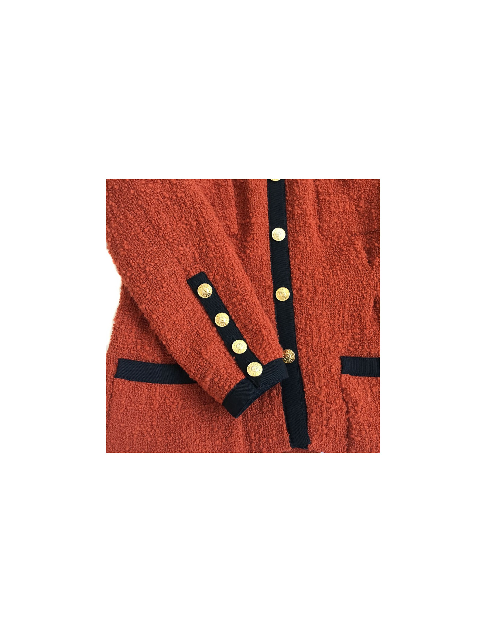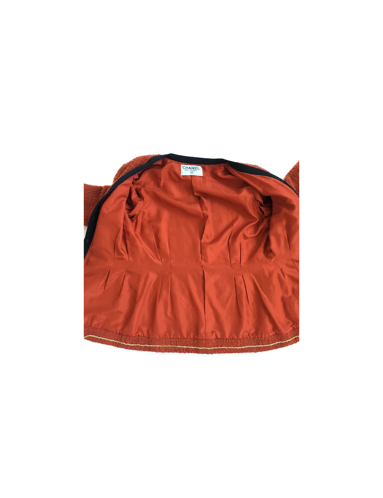 Belle veste classique de la maison "CHANEL" en tweed de couleur rouge orangé et gros grain noir bordant la veste.