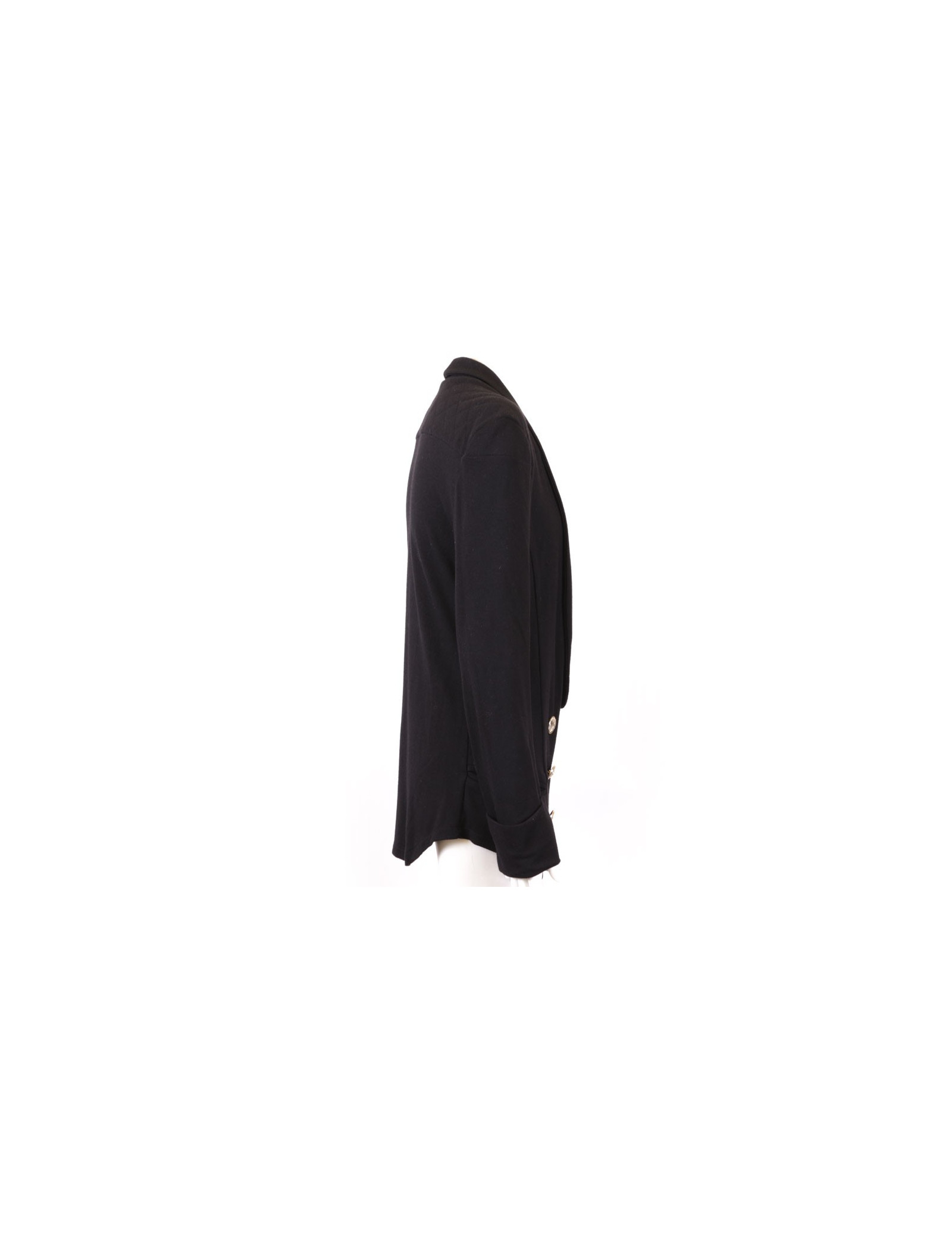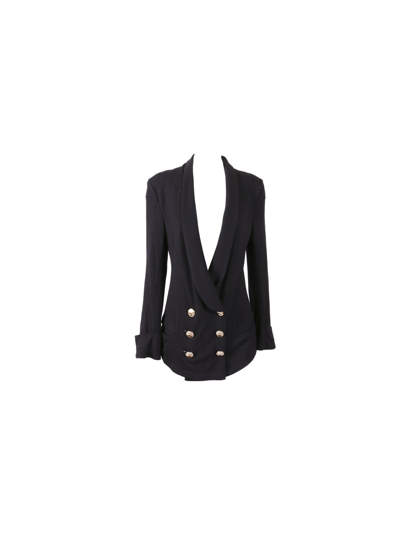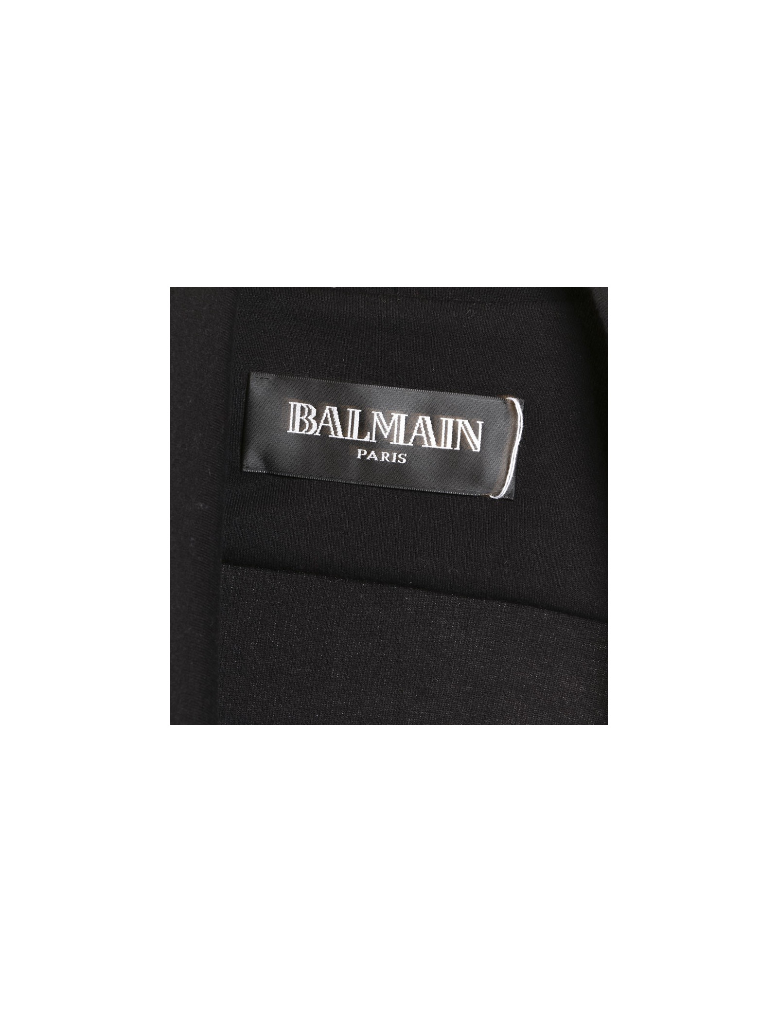 Long gilet ample noir BALMAIN avec des gros boutons dorés, représentant l'emblème ruse "Aigle". Matières: cachemire, viscose, angora, polyamide. Les épaules sont matelassées.