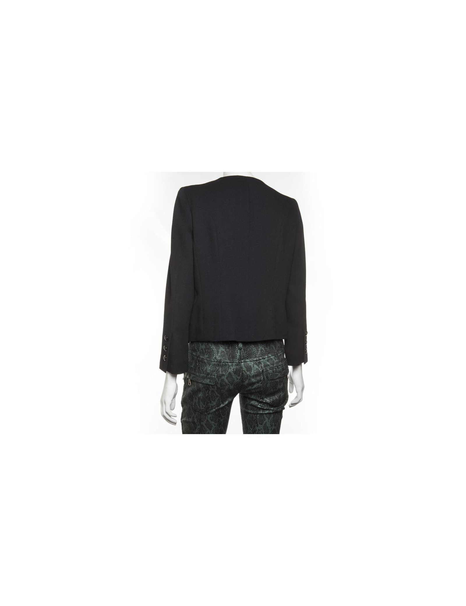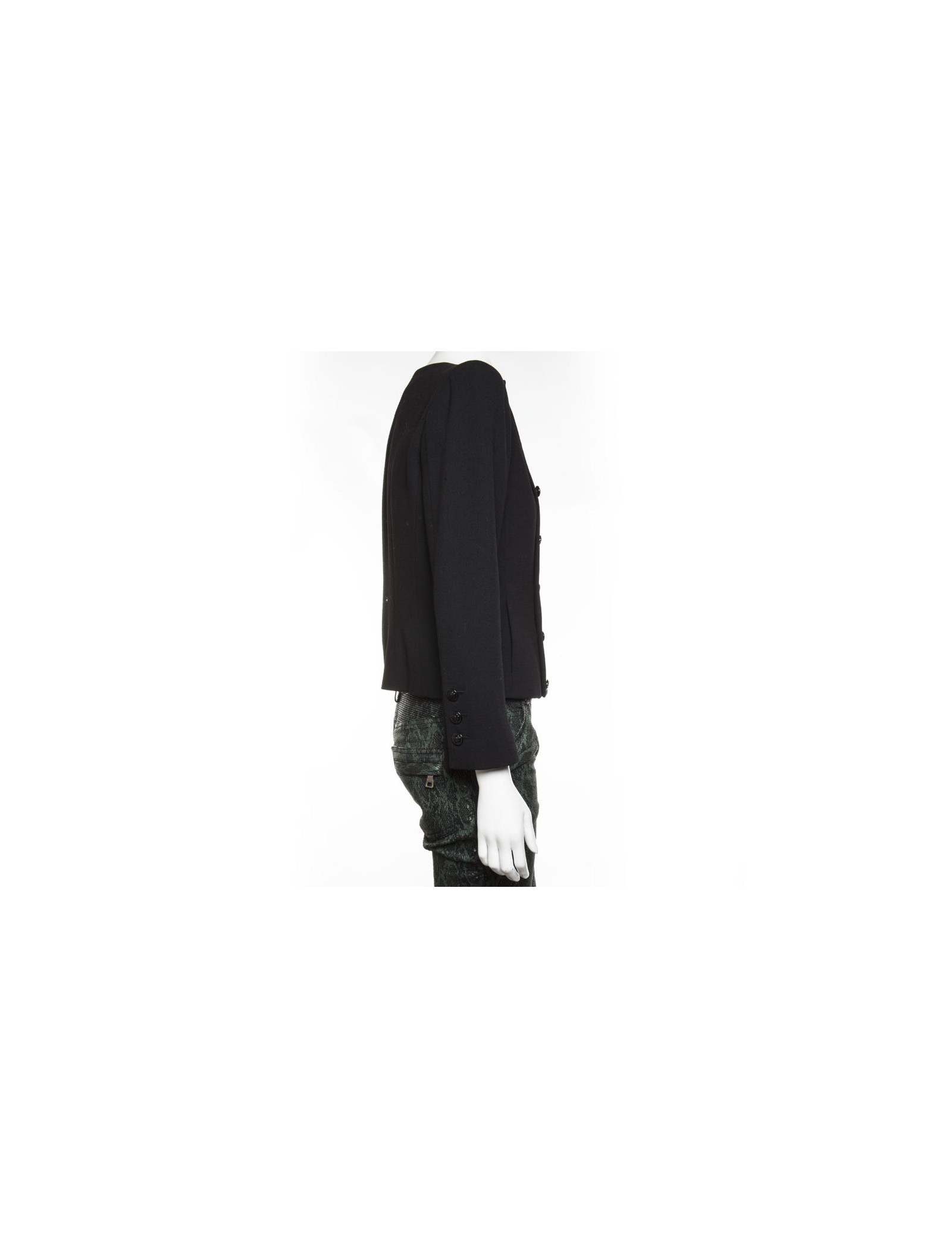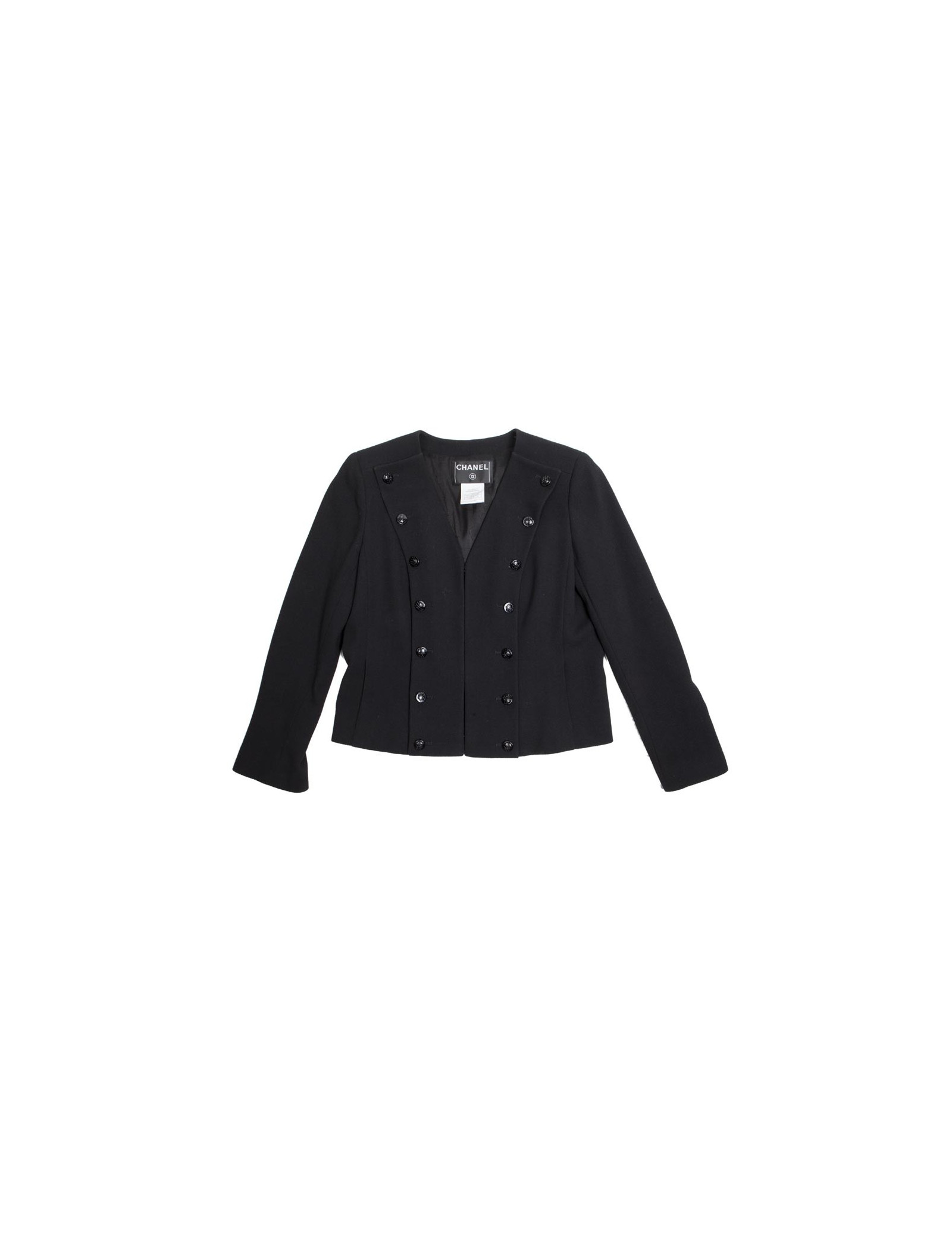 Veste Chanel en laine noire taille 40. Ornée de boutons marqués "Chanel Paris", se ferme grâce à trois boutons en agrafe. L'intérieur de la veste, doublé de soie au monogramme Chanel, est bordé par une fine chaîne en argent. Elle comporte deux poches discrètes à l'avant.