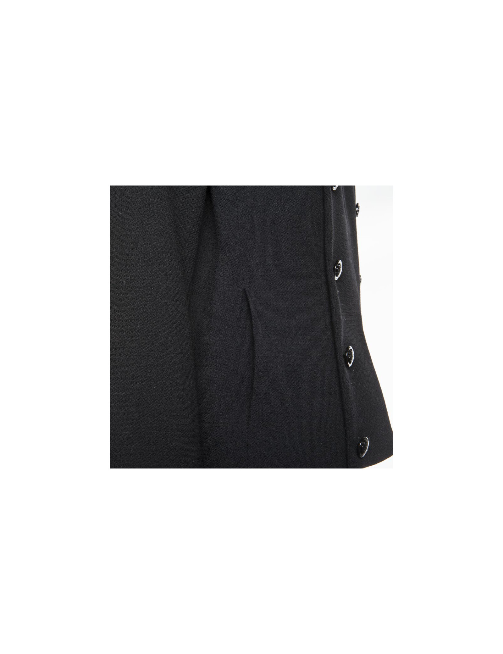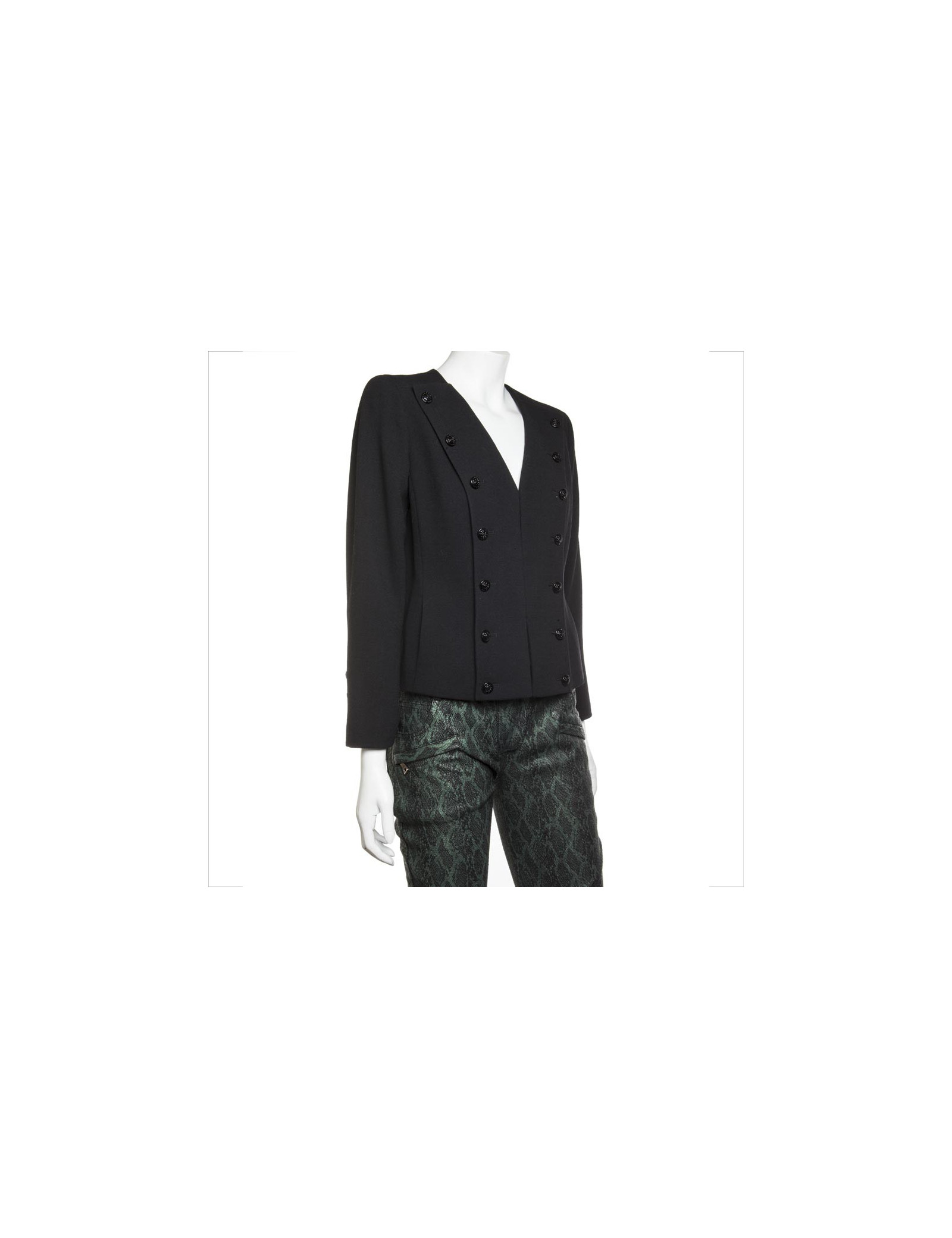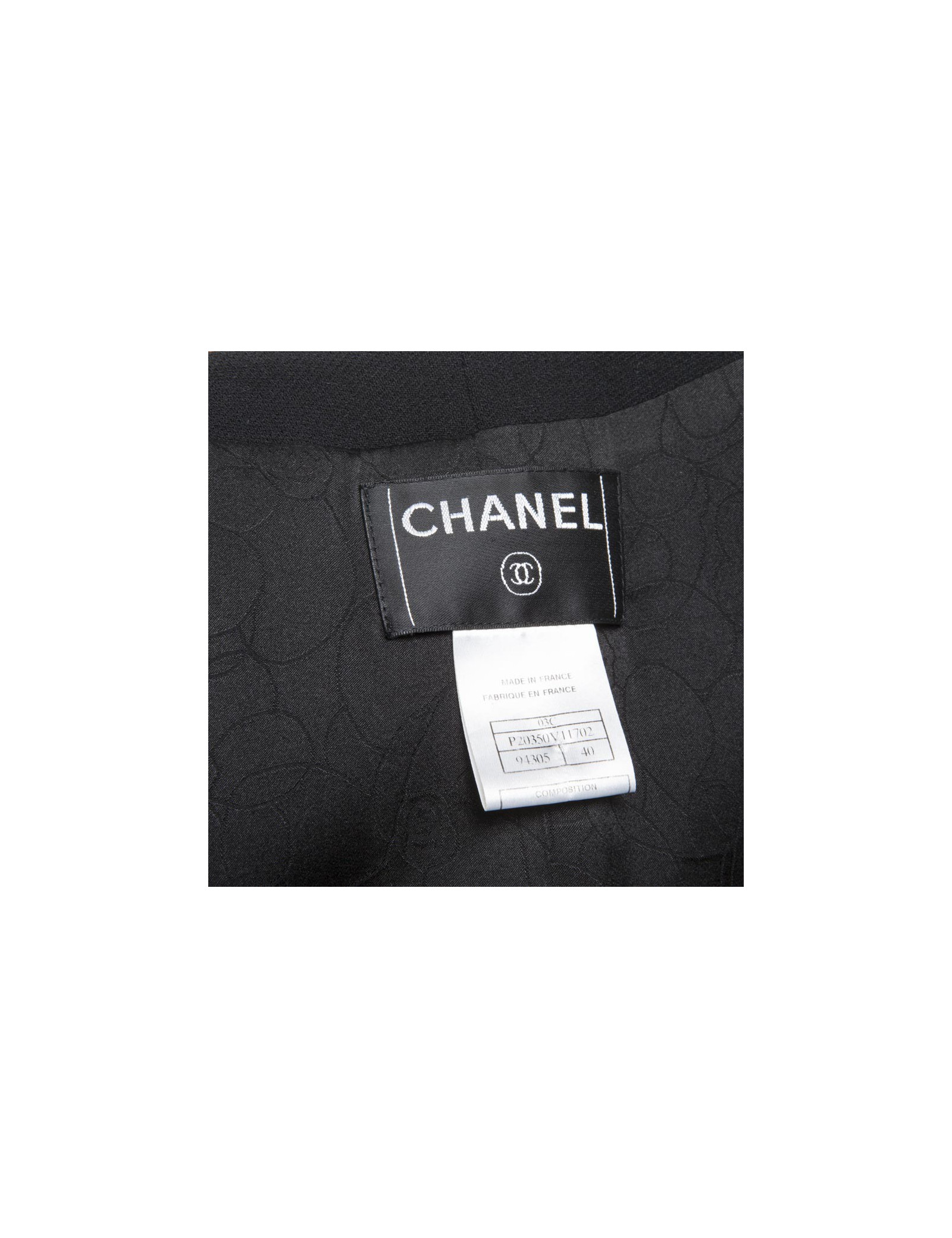 Veste Chanel en laine noire taille 40. Ornée de boutons marqués "Chanel Paris", se ferme grâce à trois boutons en agrafe. L'intérieur de la veste, doublé de soie au monogramme Chanel, est bordé par une fine chaîne en argent. Elle comporte deux poches discrètes à l'avant.