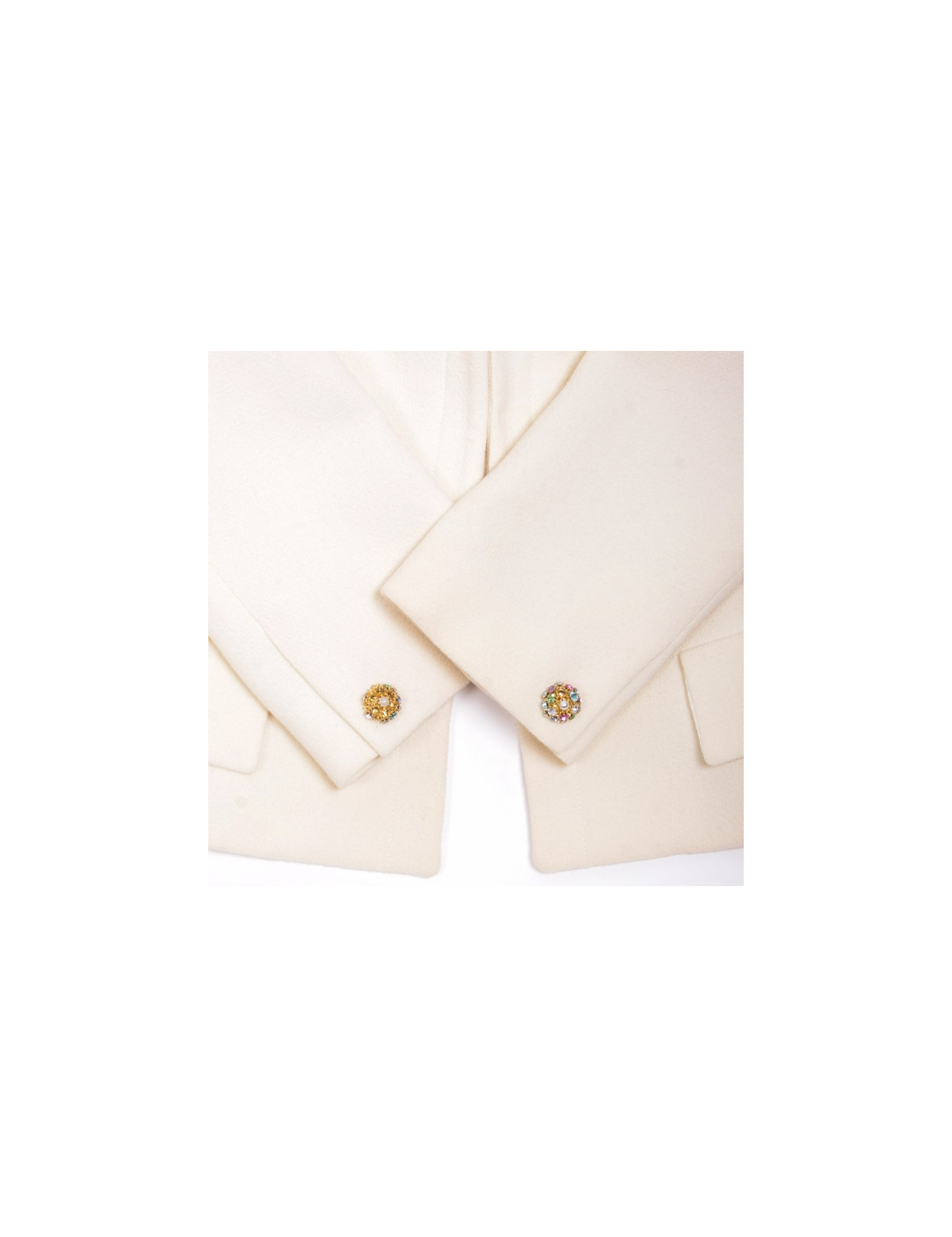 Veste Haute Couture, en laine blanche Carven, correspond à un 36. Doublée de soie blanche, composée de deux fentes arrières, se ferme grâce à une rangée de pressions accompagnée d'agrafes. Les manches sont ornées de bijoux colorés surmontés chacun d'une perle blanche (voir photo).