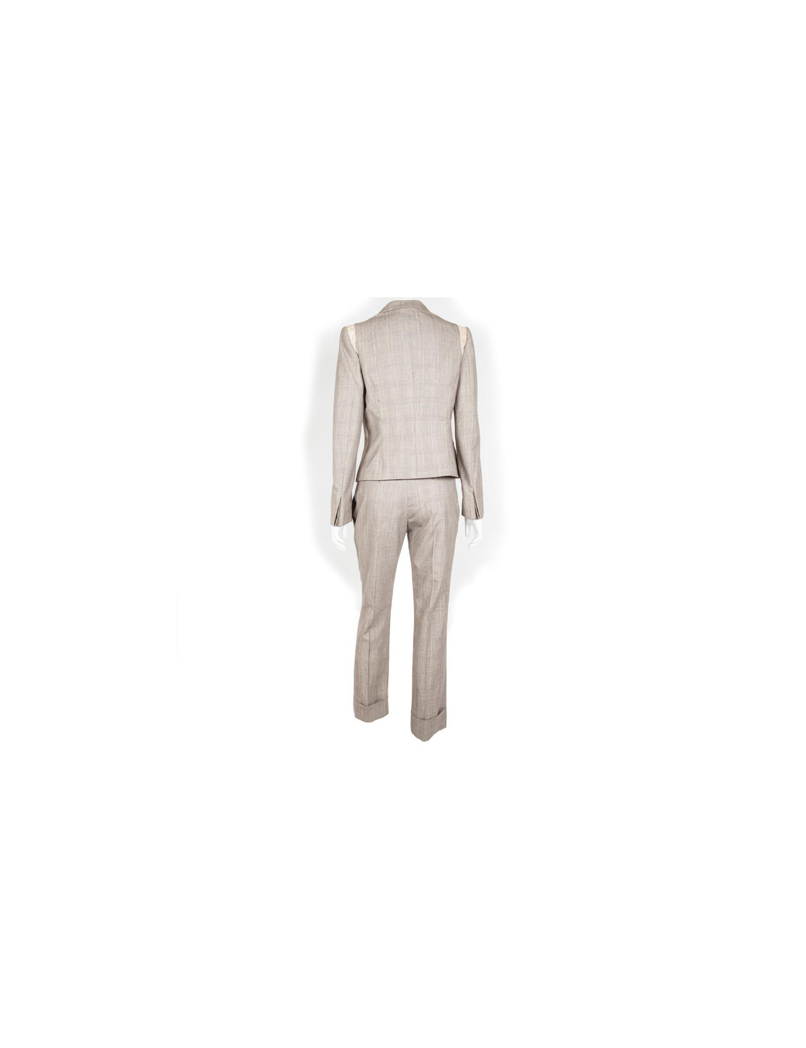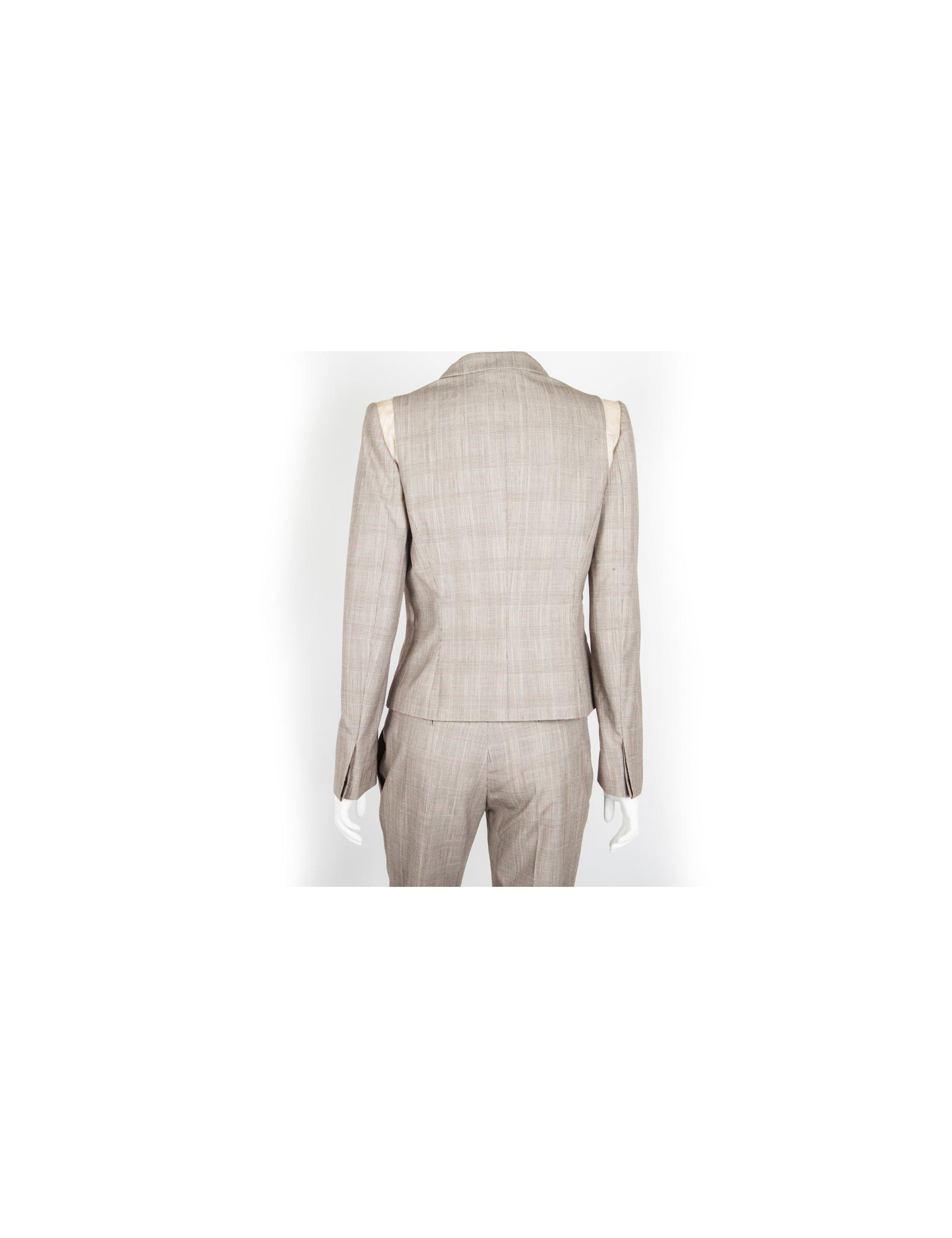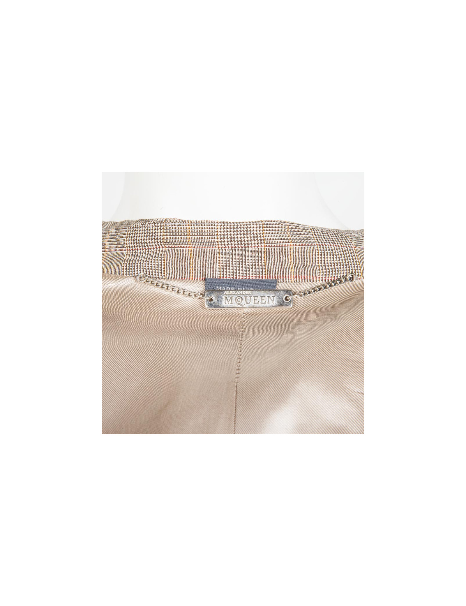 Ensemble tailleur beige en coton Alexander Mc Queen avec un motif Prince de Galles. La veste, taille 42 IT / 38 FR, est doublée de soie beige, apparente aux épaules. Se ferme grâce à une rangée de boutons dissimulés nacrés et une pression. Le pantalon, est lui aussi doublé de soie, composé de deux poches latérales et orné de revers de 7 cm. Fermeture zippée accompagnée d'une agrafe, contient des passants de ceinture discrets. Il est en bon