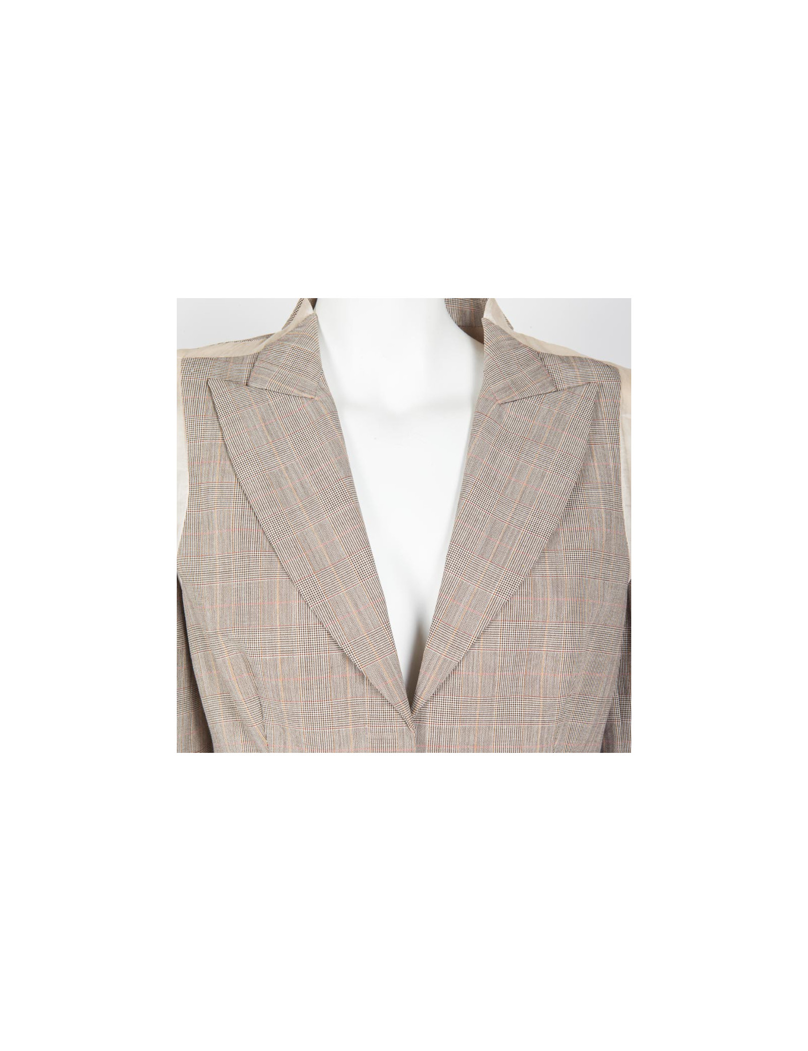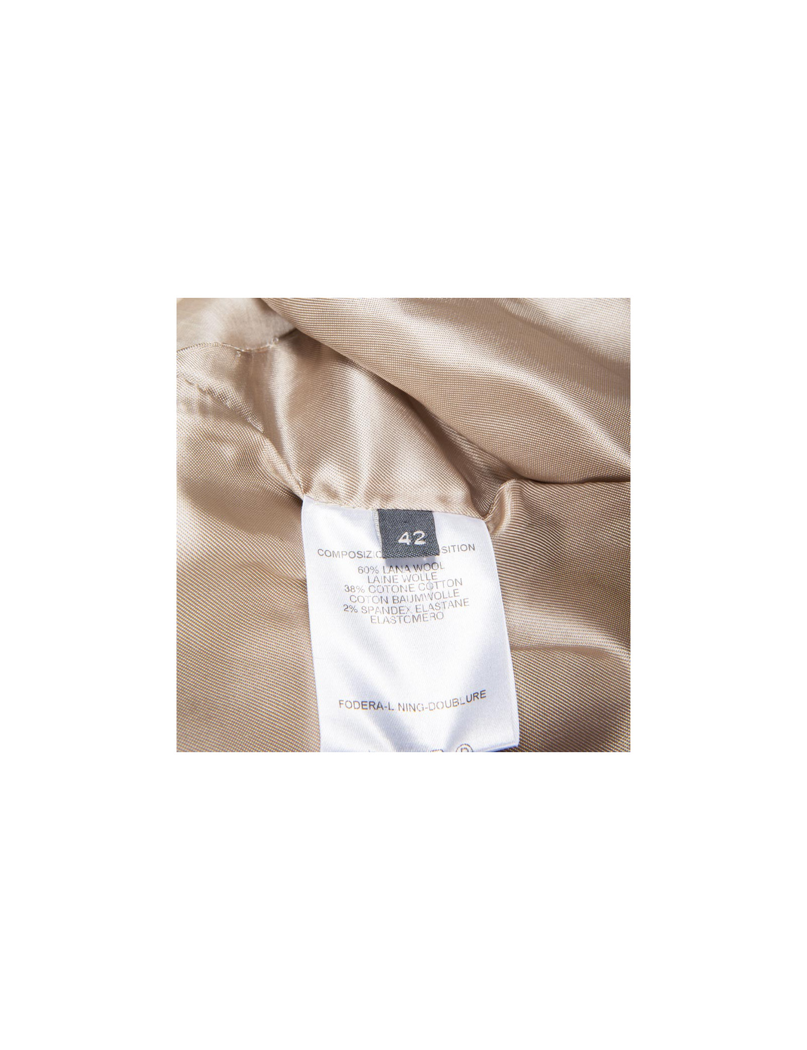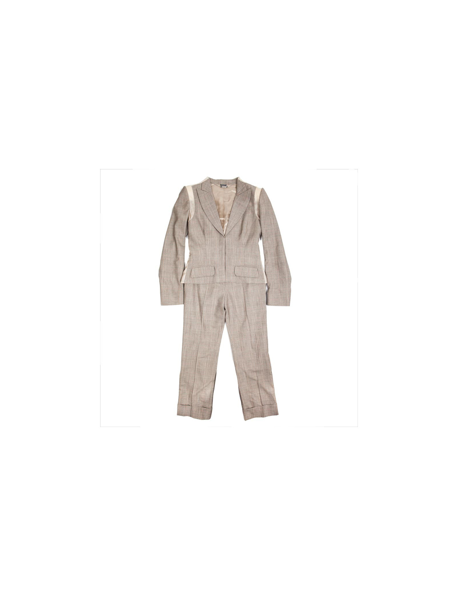 Ensemble tailleur beige en coton Alexander Mc Queen avec un motif Prince de Galles. La veste, taille 42 IT / 38 FR, est doublée de soie beige, apparente aux épaules. Se ferme grâce à une rangée de boutons dissimulés nacrés et une pression. Le pantalon, est lui aussi doublé de soie, composé de deux poches latérales et orné de revers de 7 cm. Fermeture zippée accompagnée d'une agrafe, contient des passants de ceinture discrets. Il est en bon