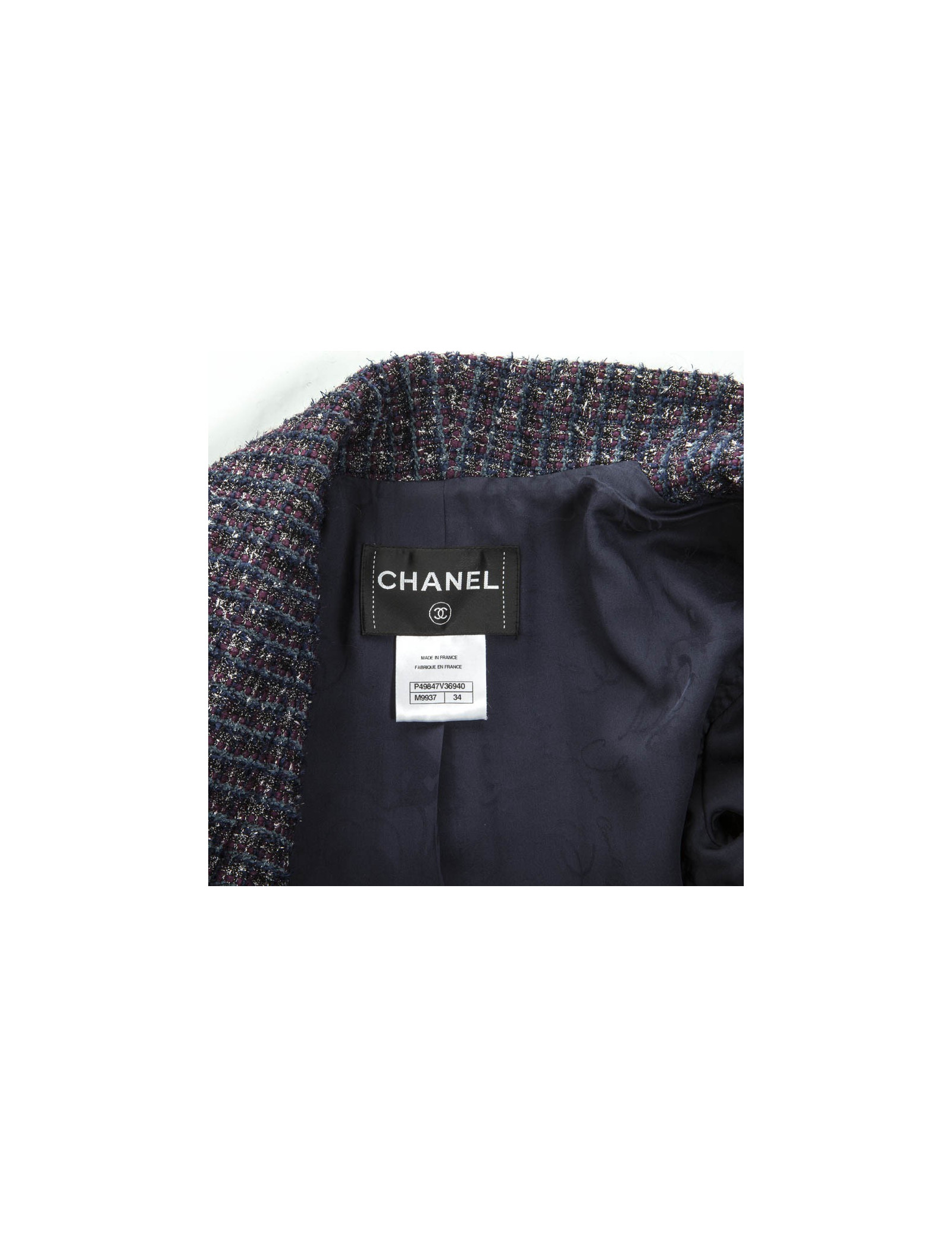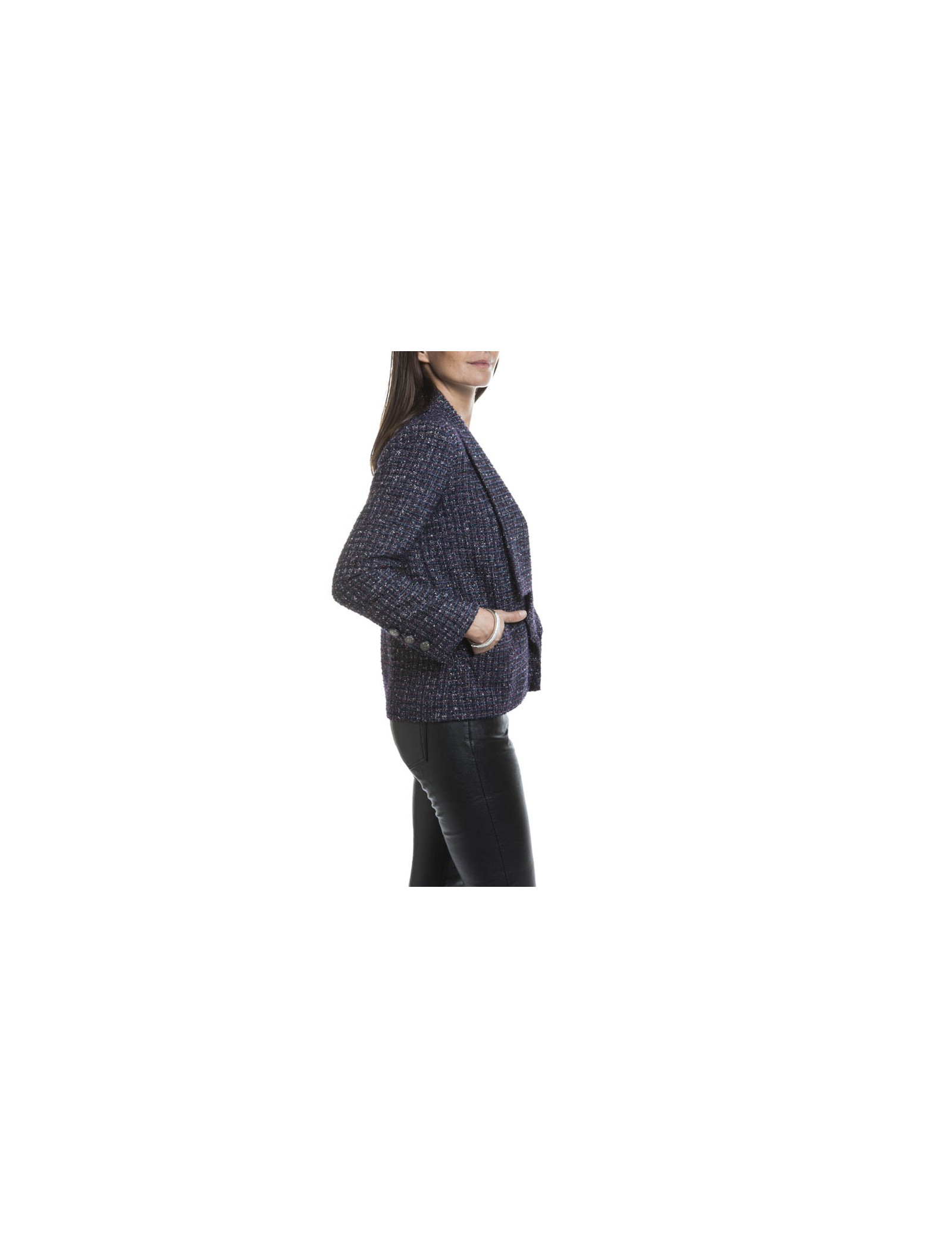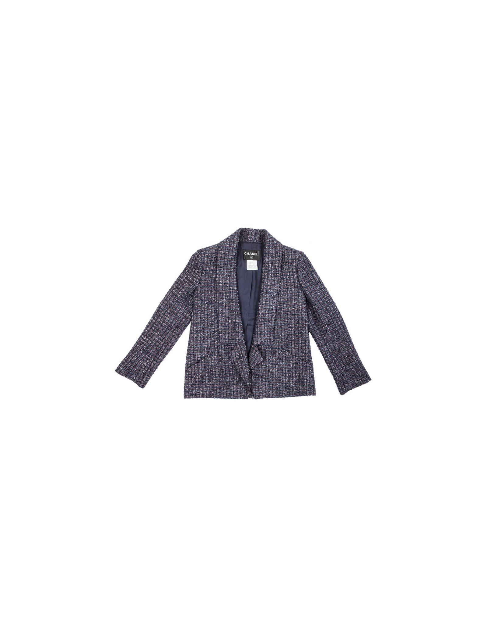 Veste de la Maison Chanel en tweed avec un dégradé de couleurs : bleu marine, violet, noir et fils d'argent. Ne se ferme pas. Deux poches en biais de chaque côté. Doublure bleu marine camélias en soie. En très bon état.