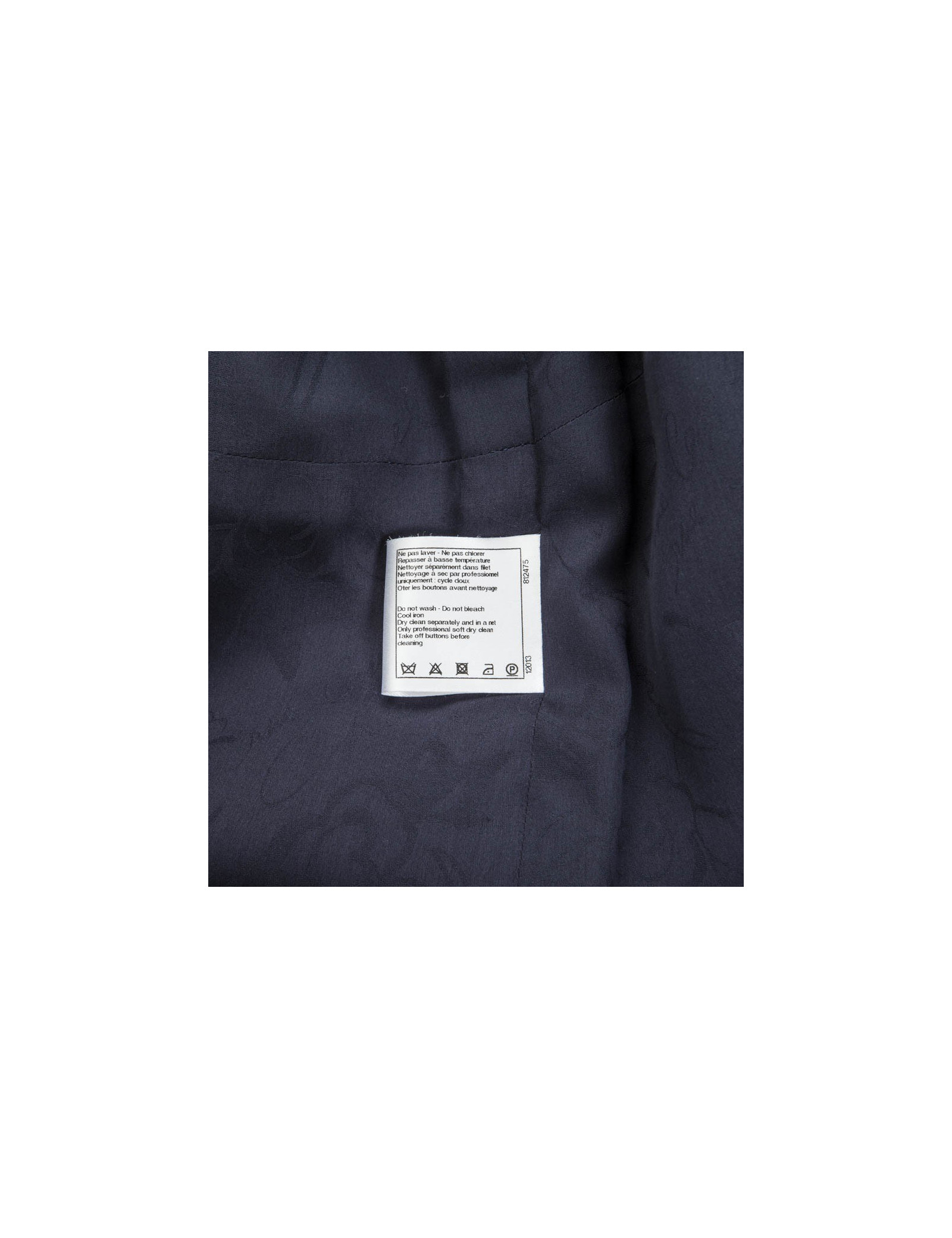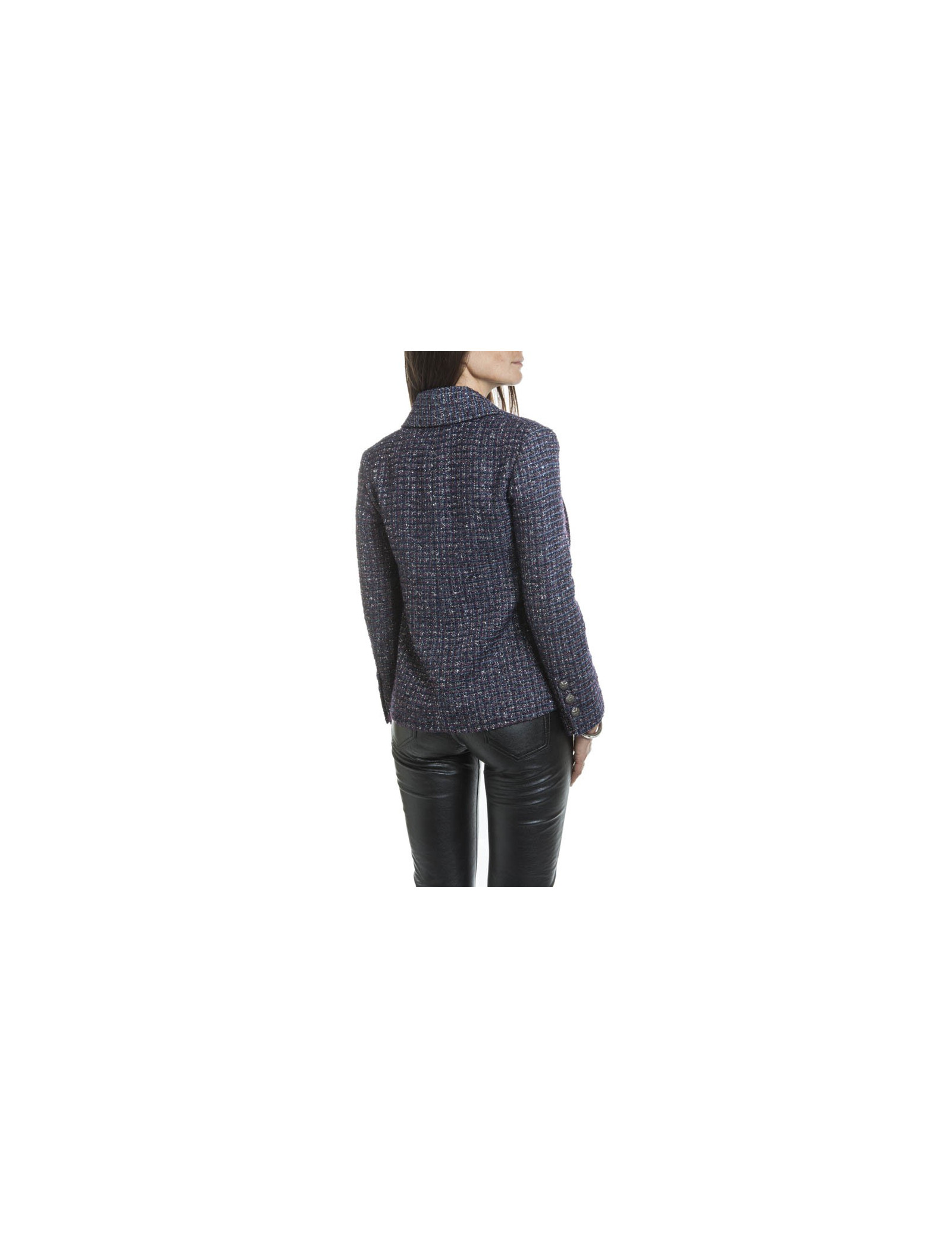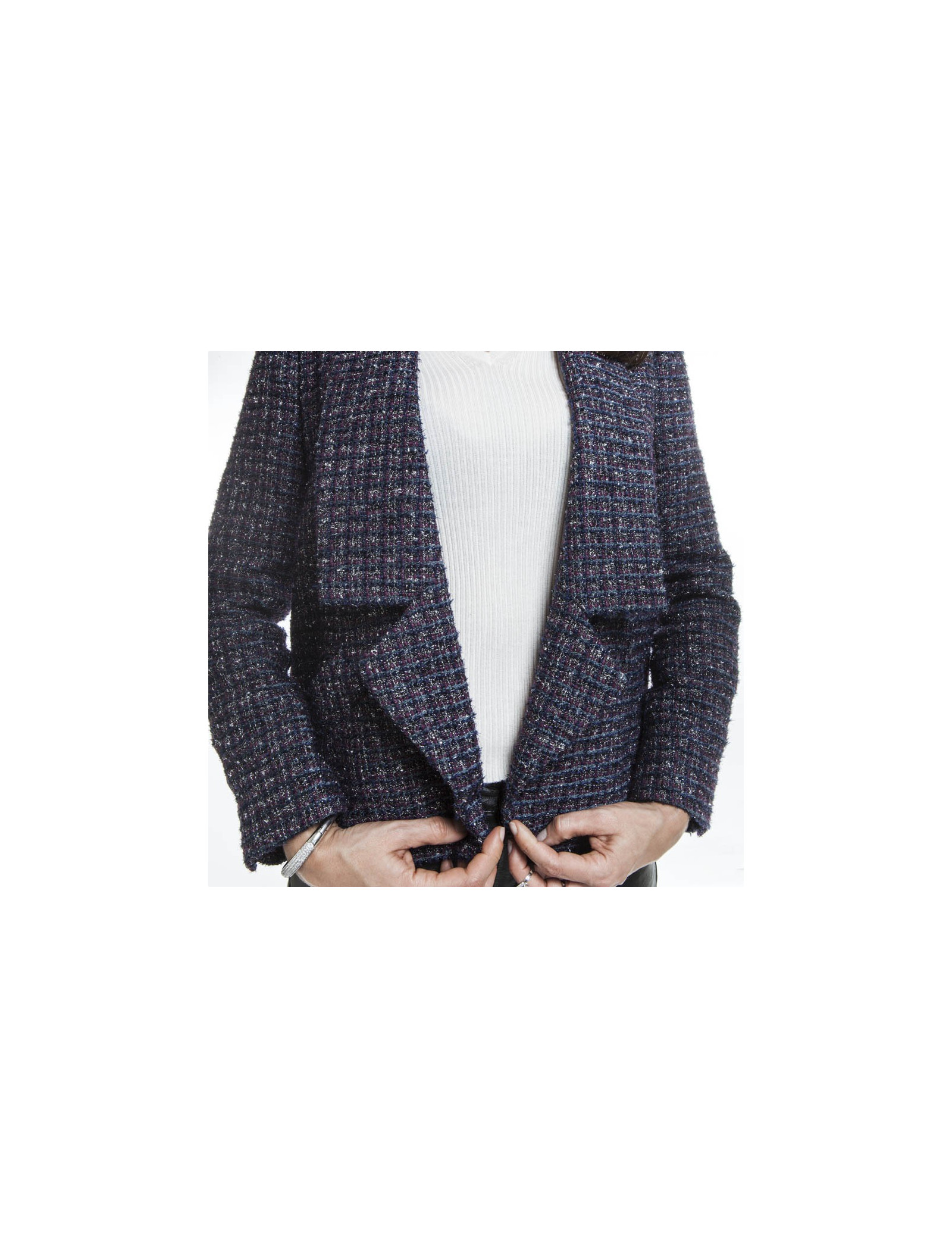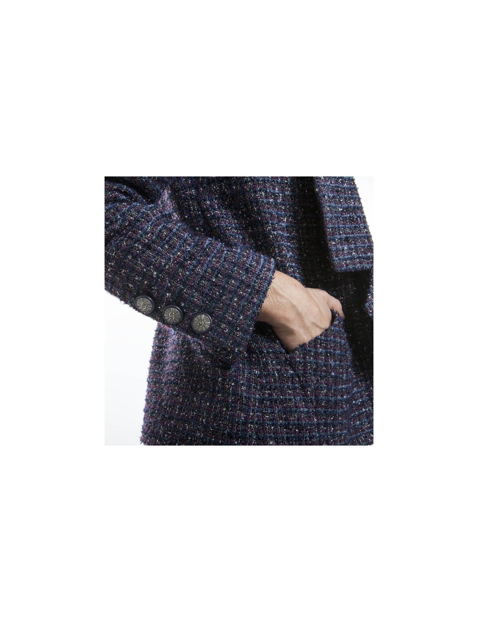 Veste de la Maison Chanel en tweed avec un dégradé de couleurs : bleu marine, violet, noir et fils d'argent. Ne se ferme pas. Deux poches en biais de chaque côté. Doublure bleu marine camélias en soie. En très bon état.