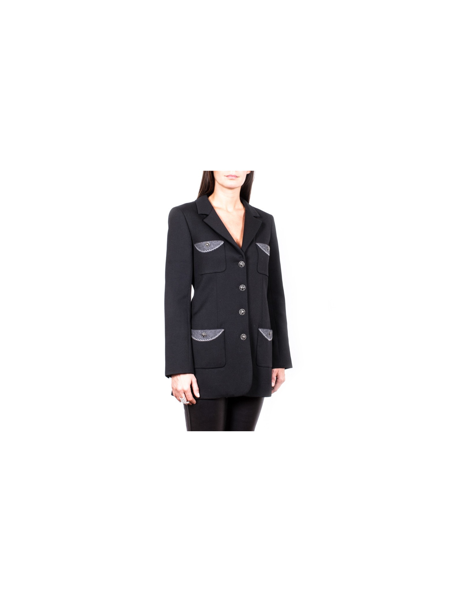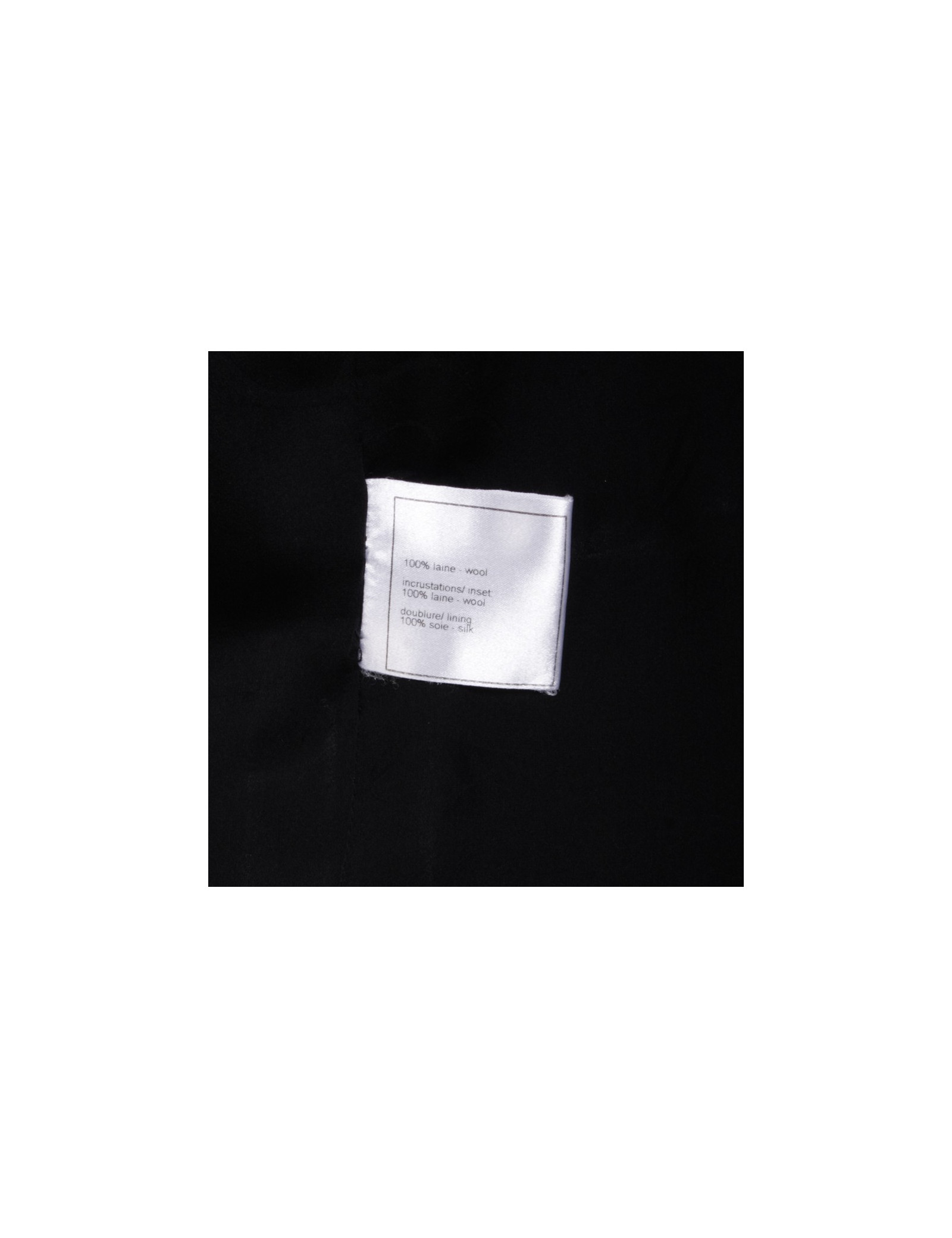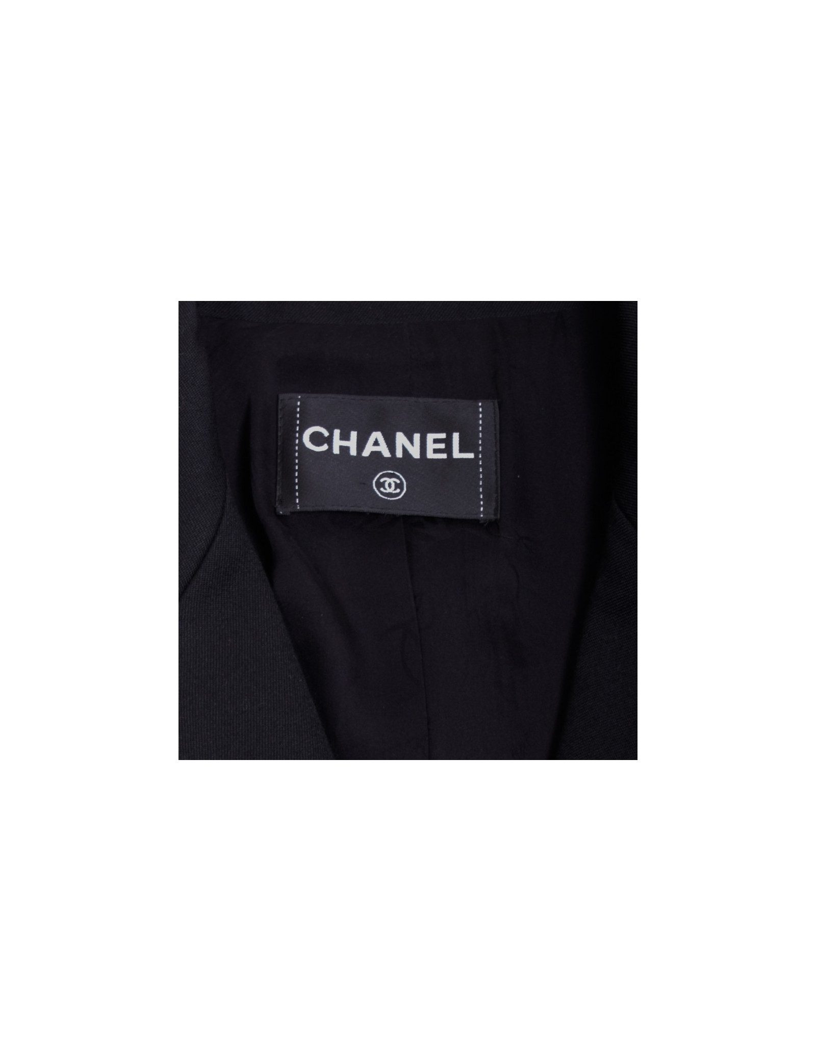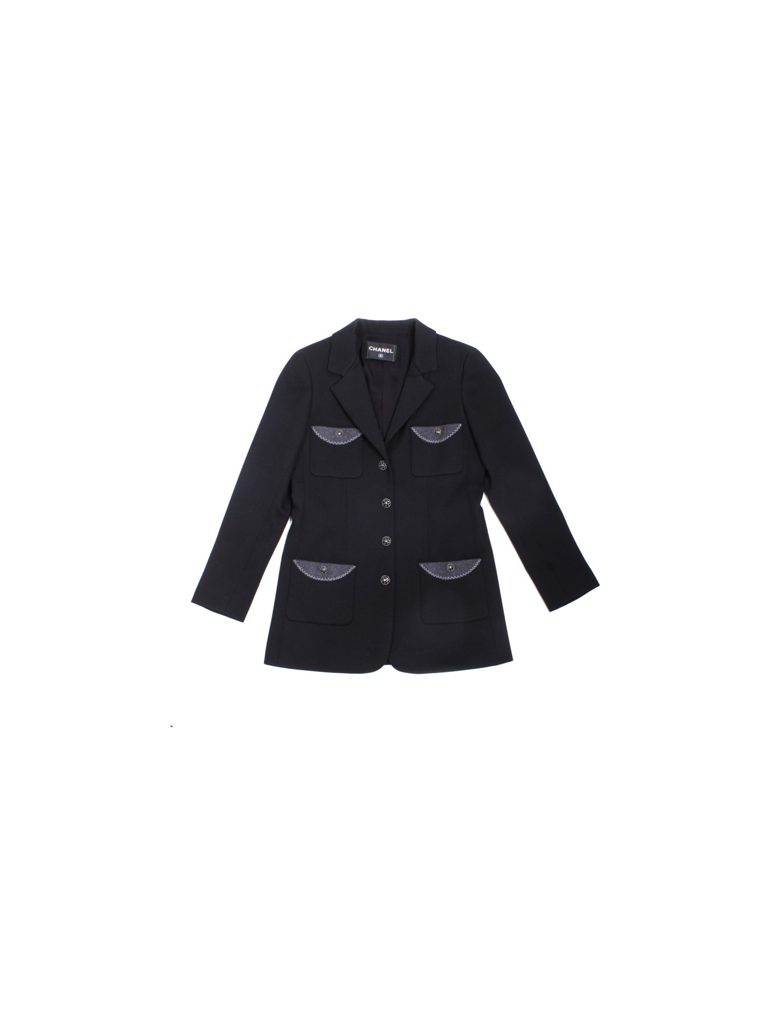 Veste Chanel en laine noire en très bon état avec 4 poches à l'avant et un revers appliqué en laine grise.