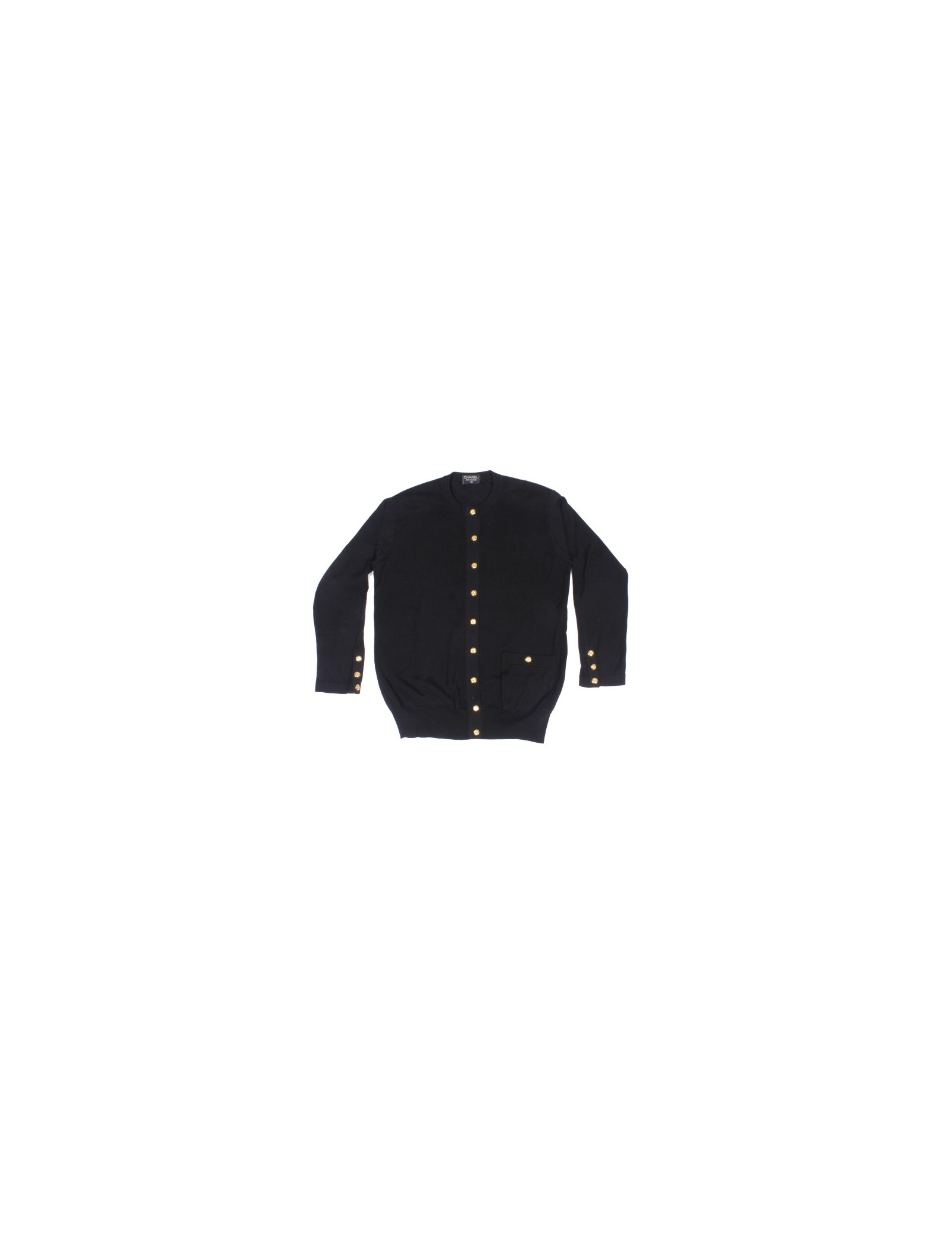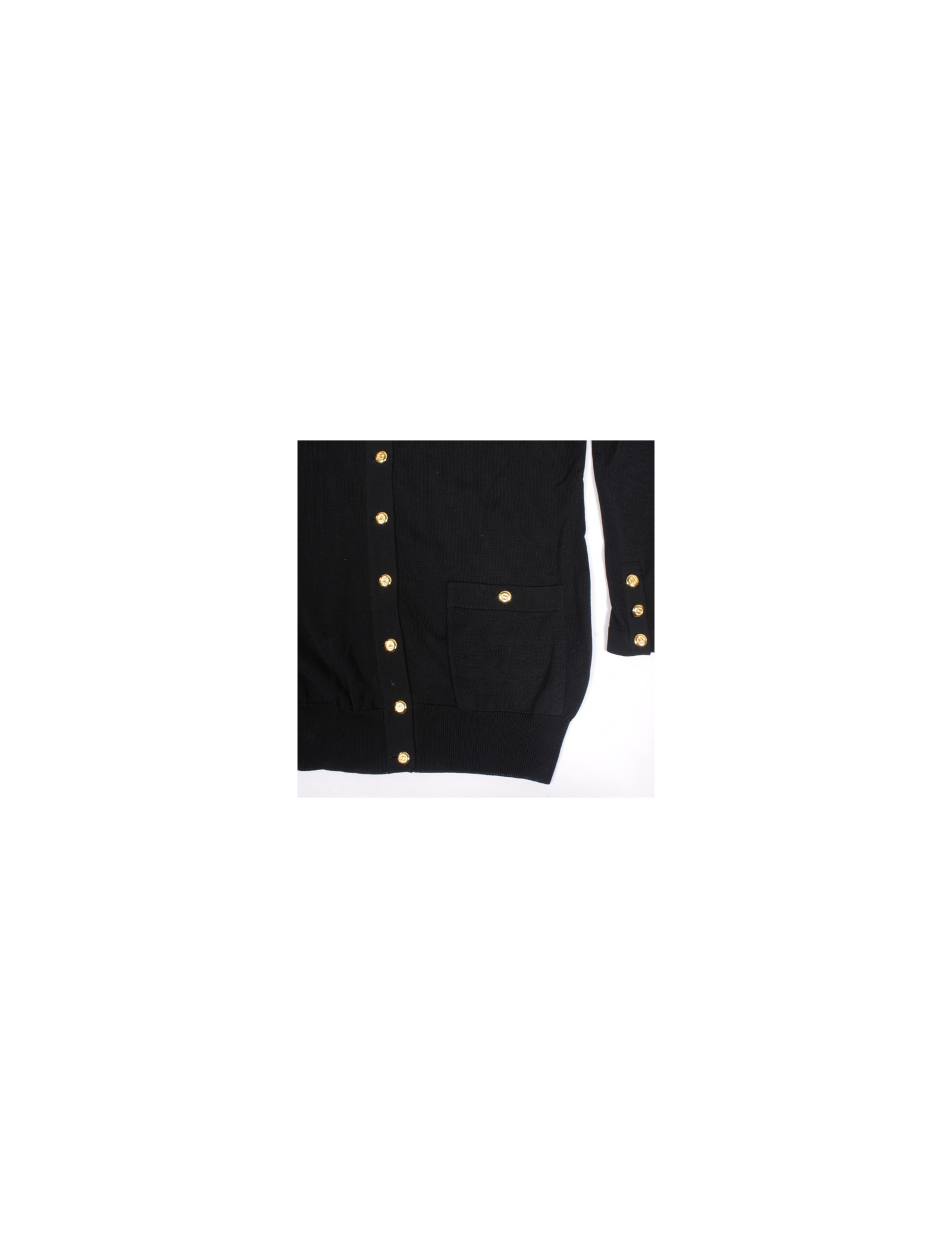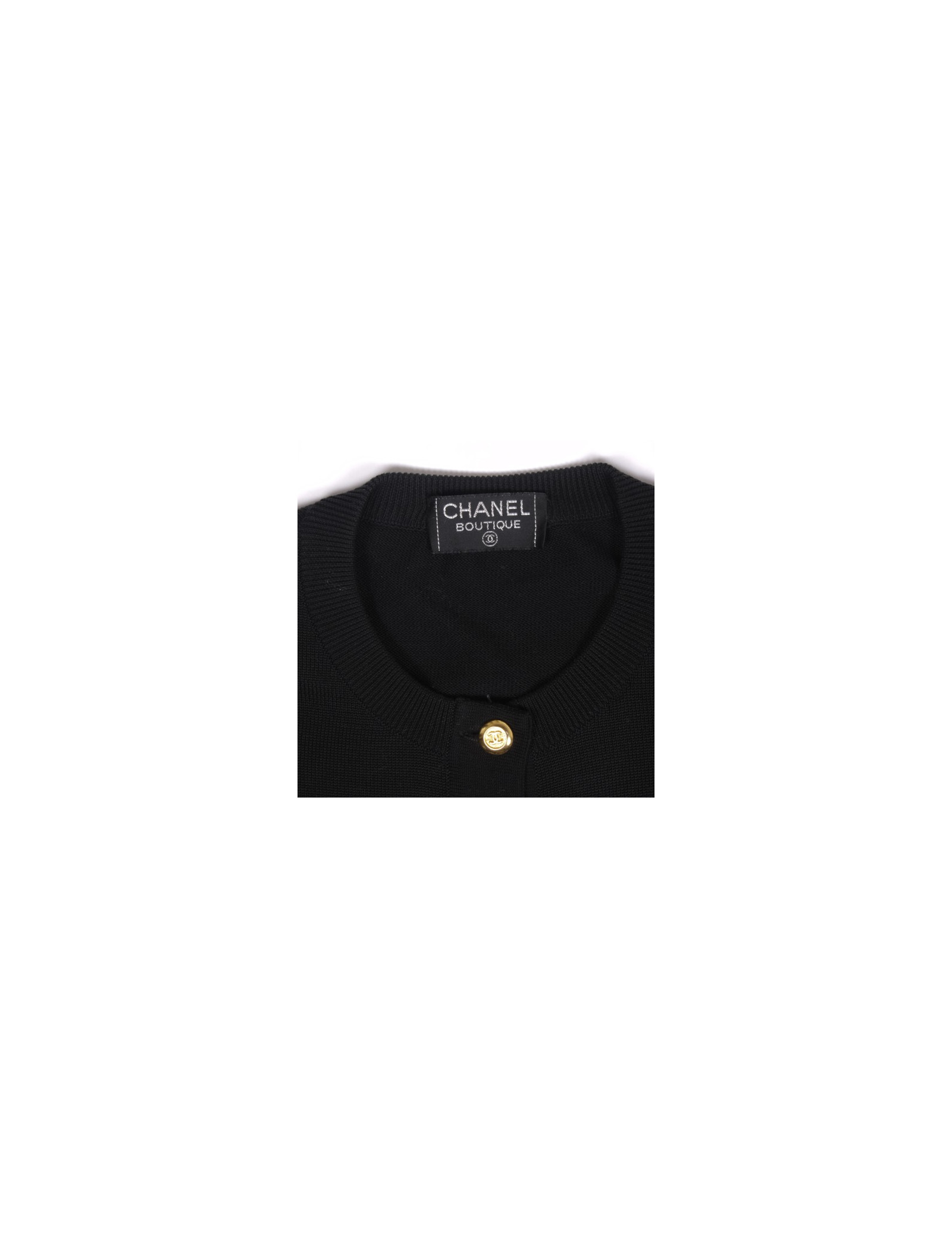 Joli cardigan CHANEL vintage en coton noir, il se ferme à l'aide de superbes boutons dorés siglés CC.