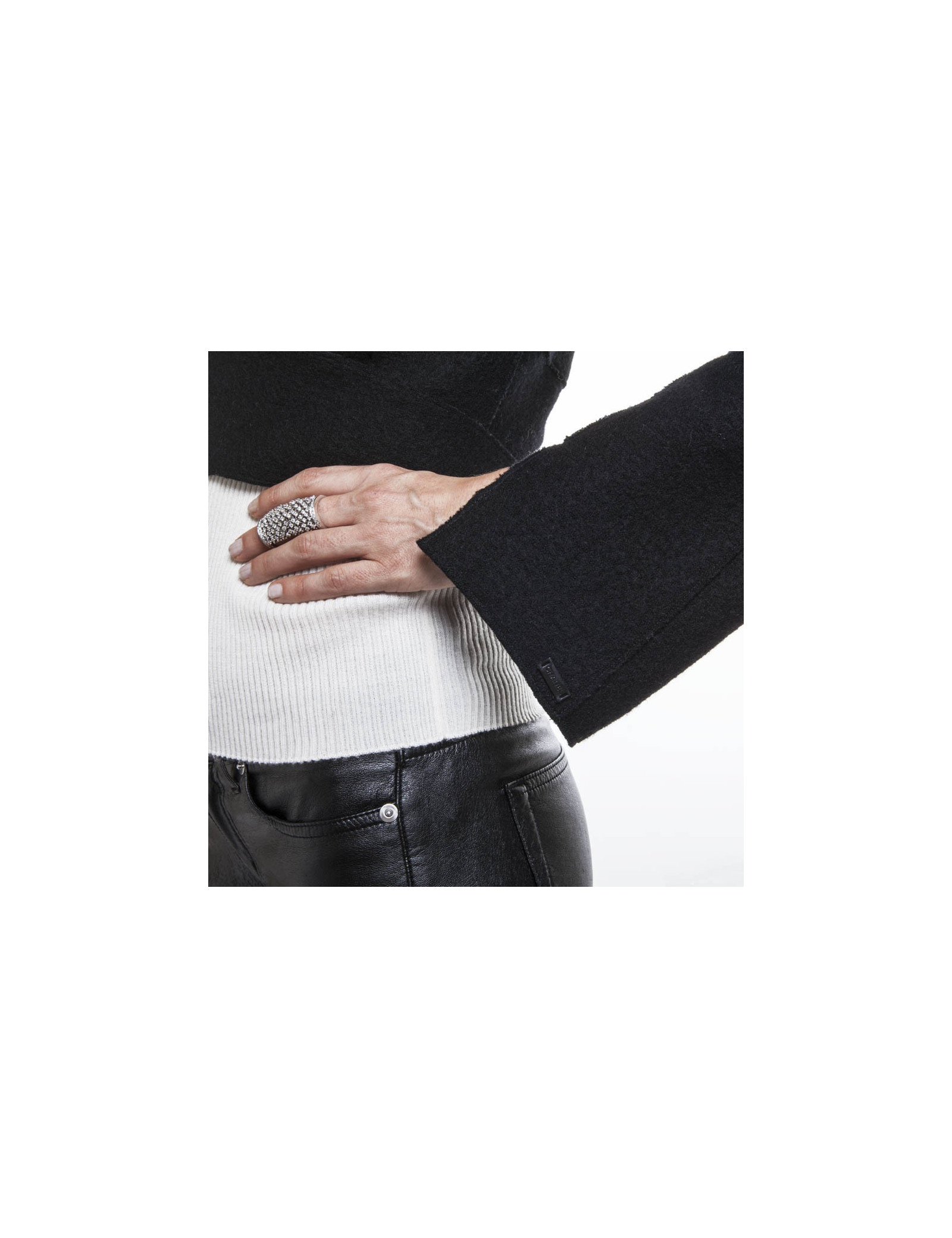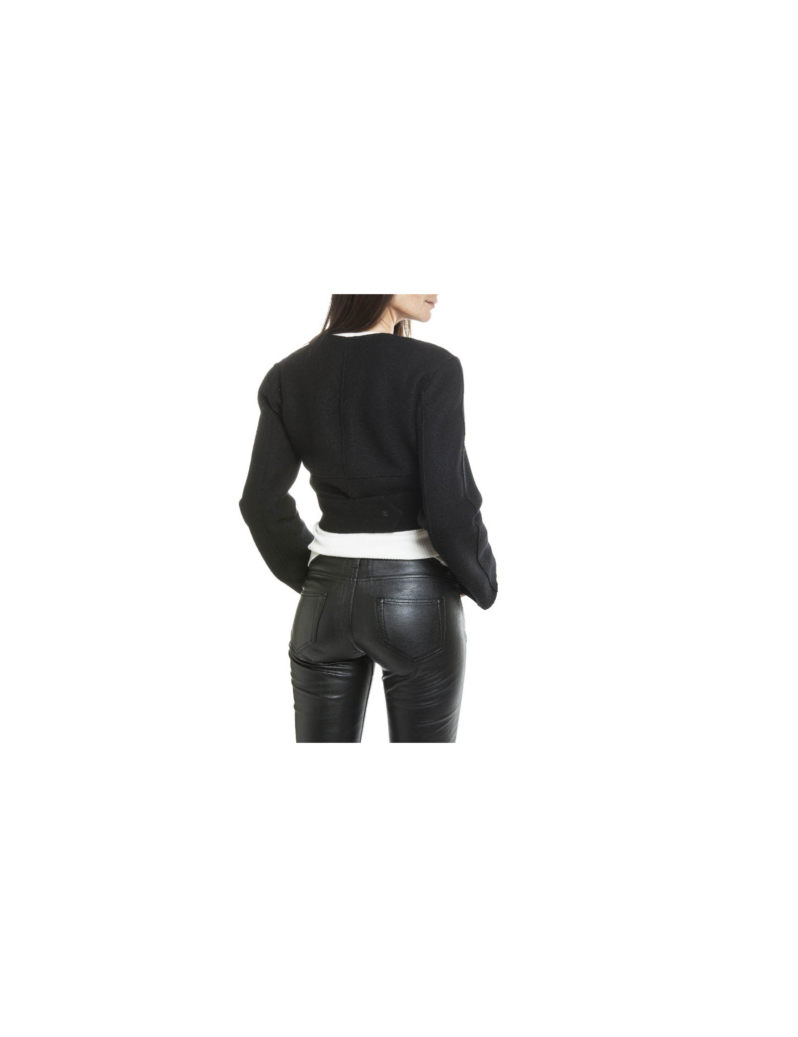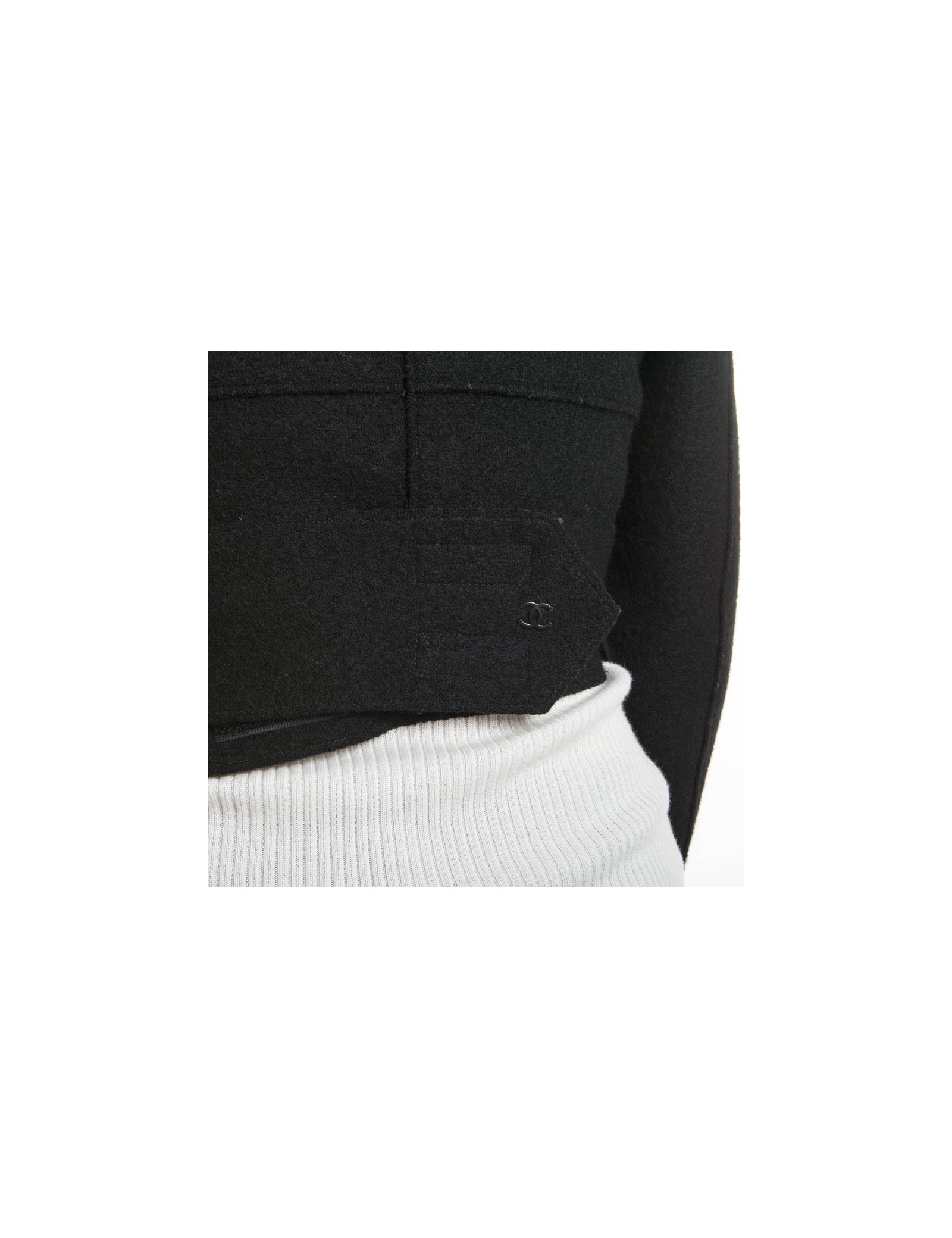 Boléro CHANEL en laine bouillie noire qui se ferme façon cache-coeur par 2 longues bandes avec du scratch au bout, brodé d'un mini sigle CC en métal noir.