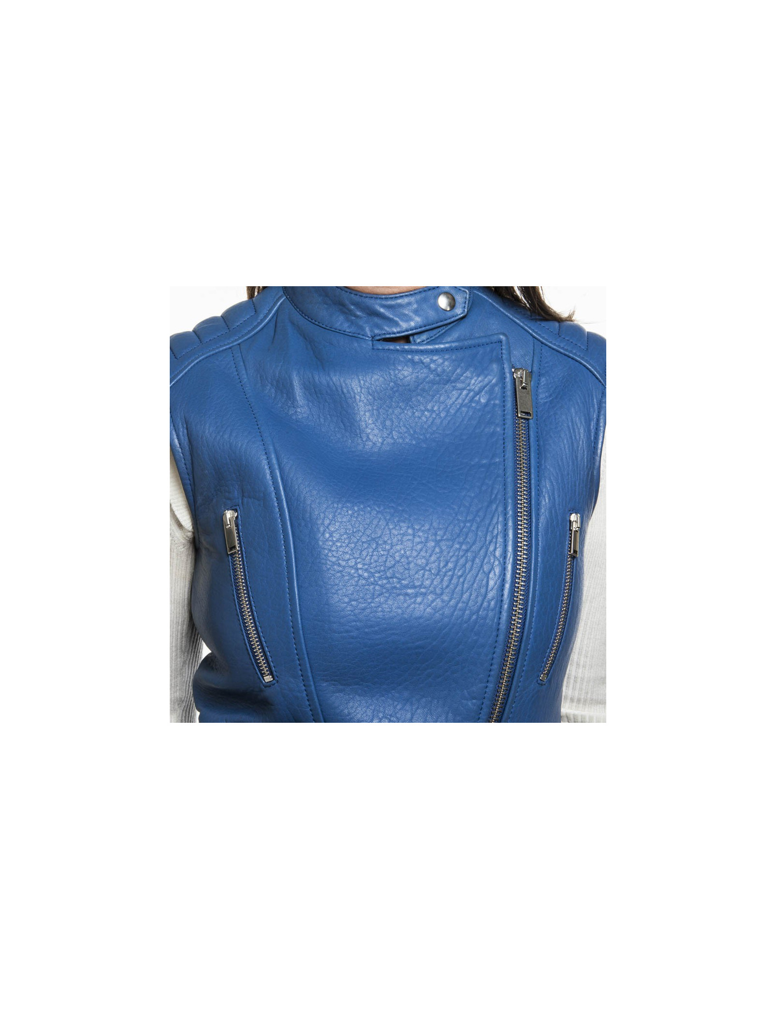 Veste Céline sans manches façon perfecto en agneau bleu électrique qui se ferme à l'aide d'une fermeture éclair en biais sur la poitrine.