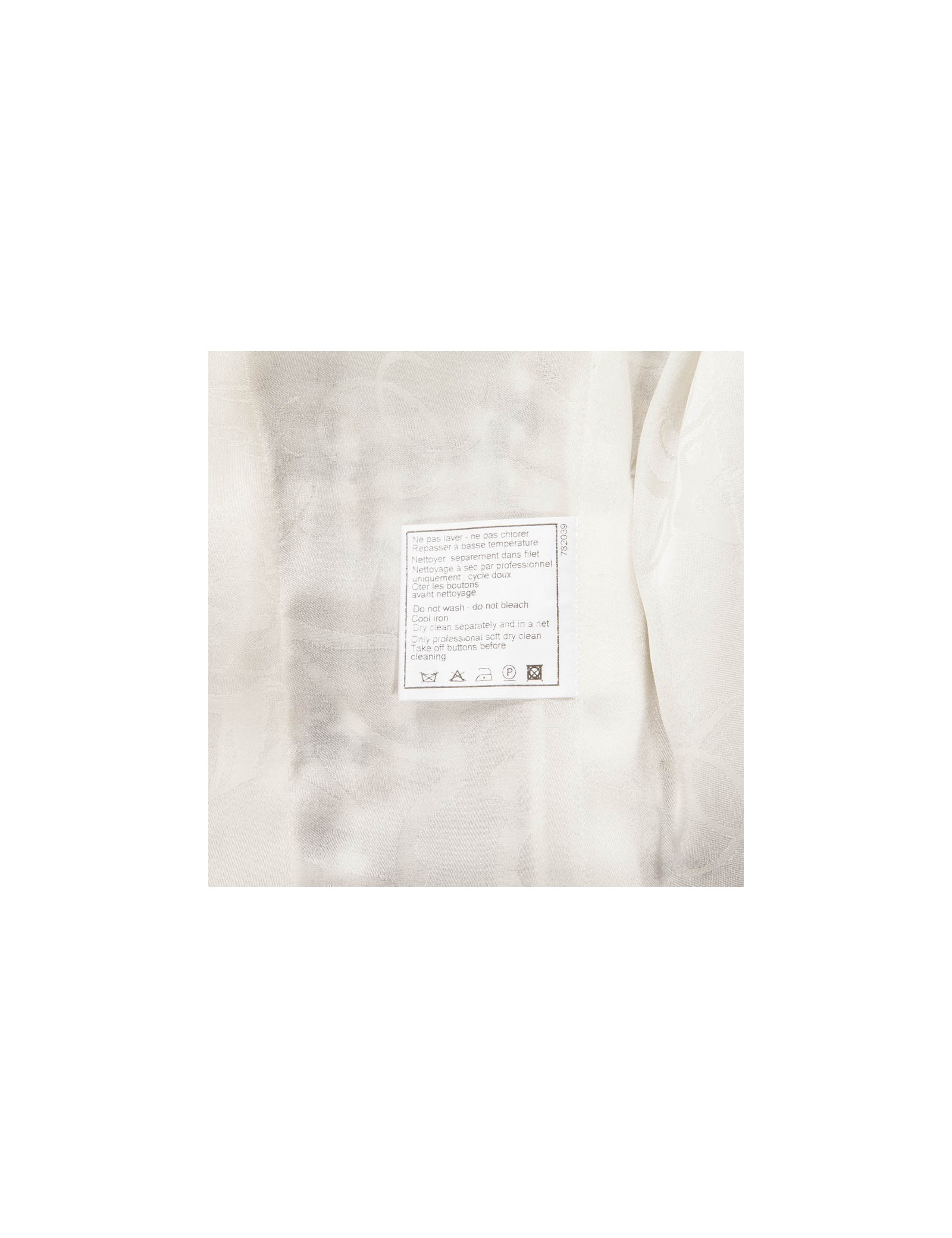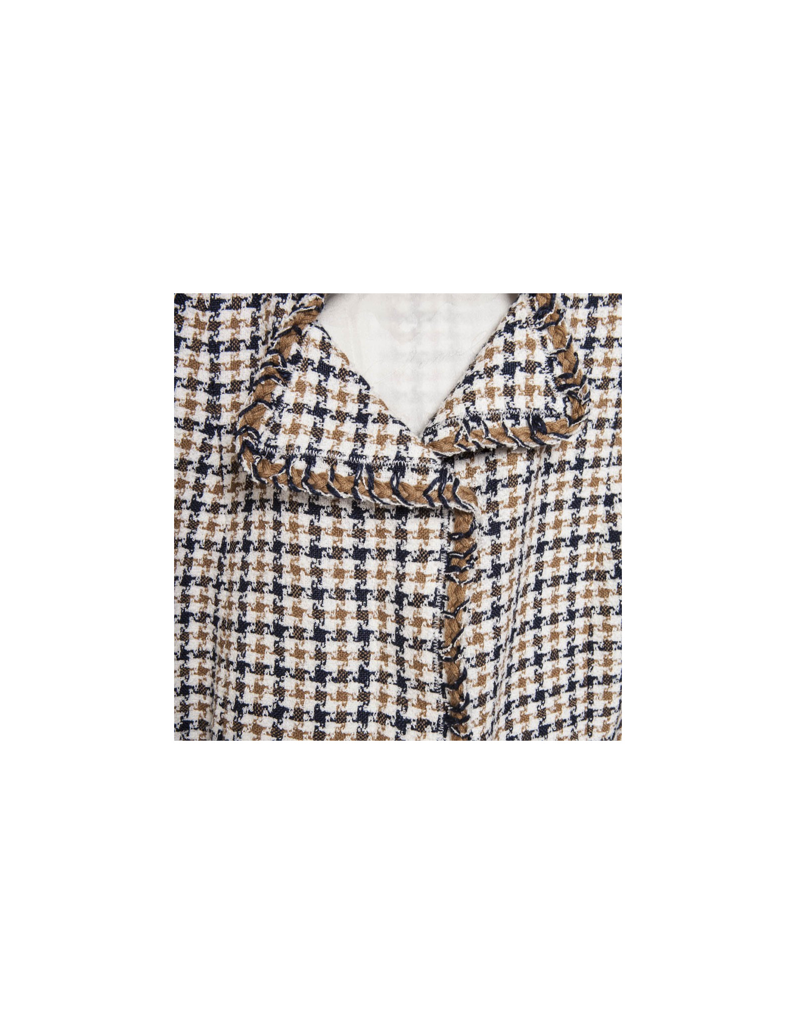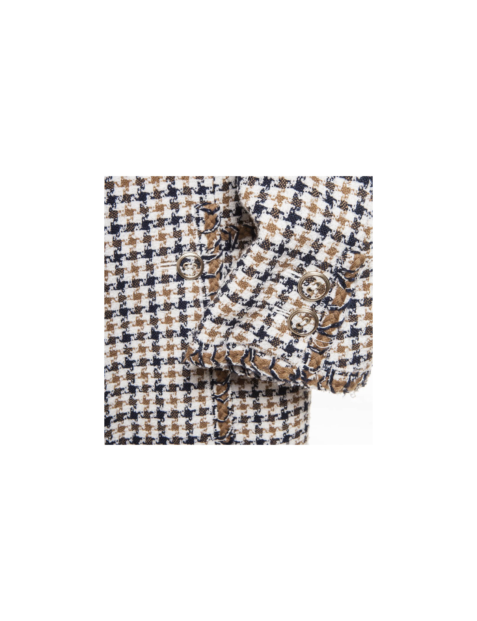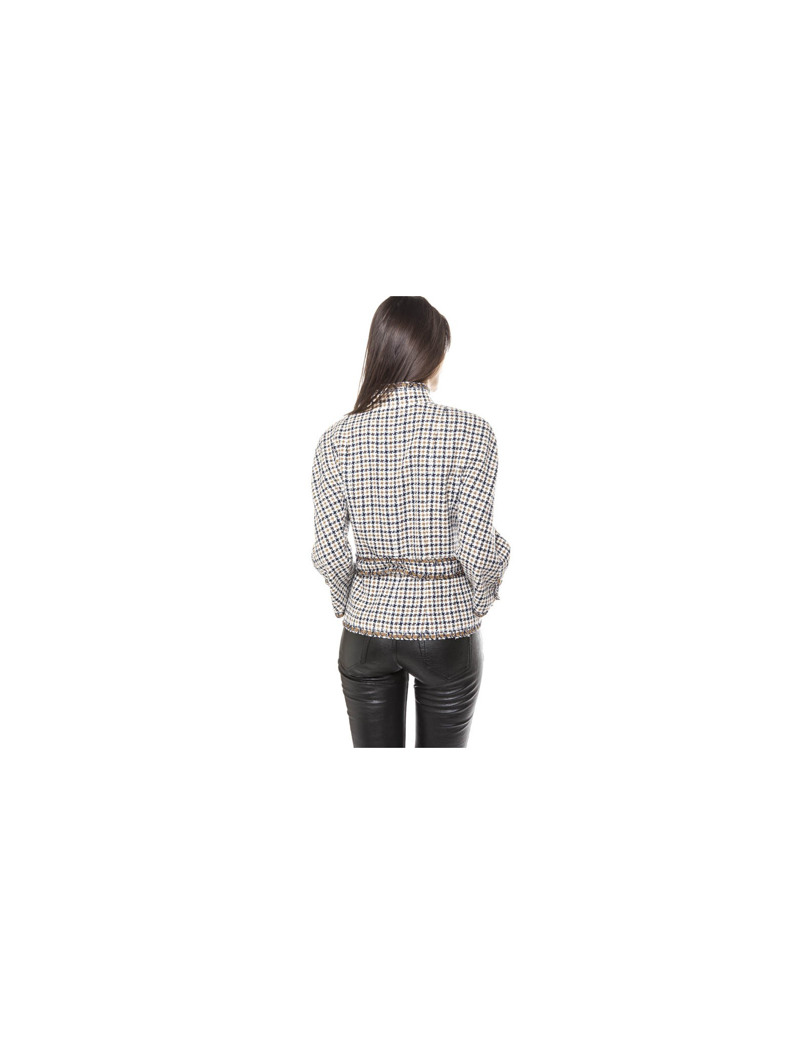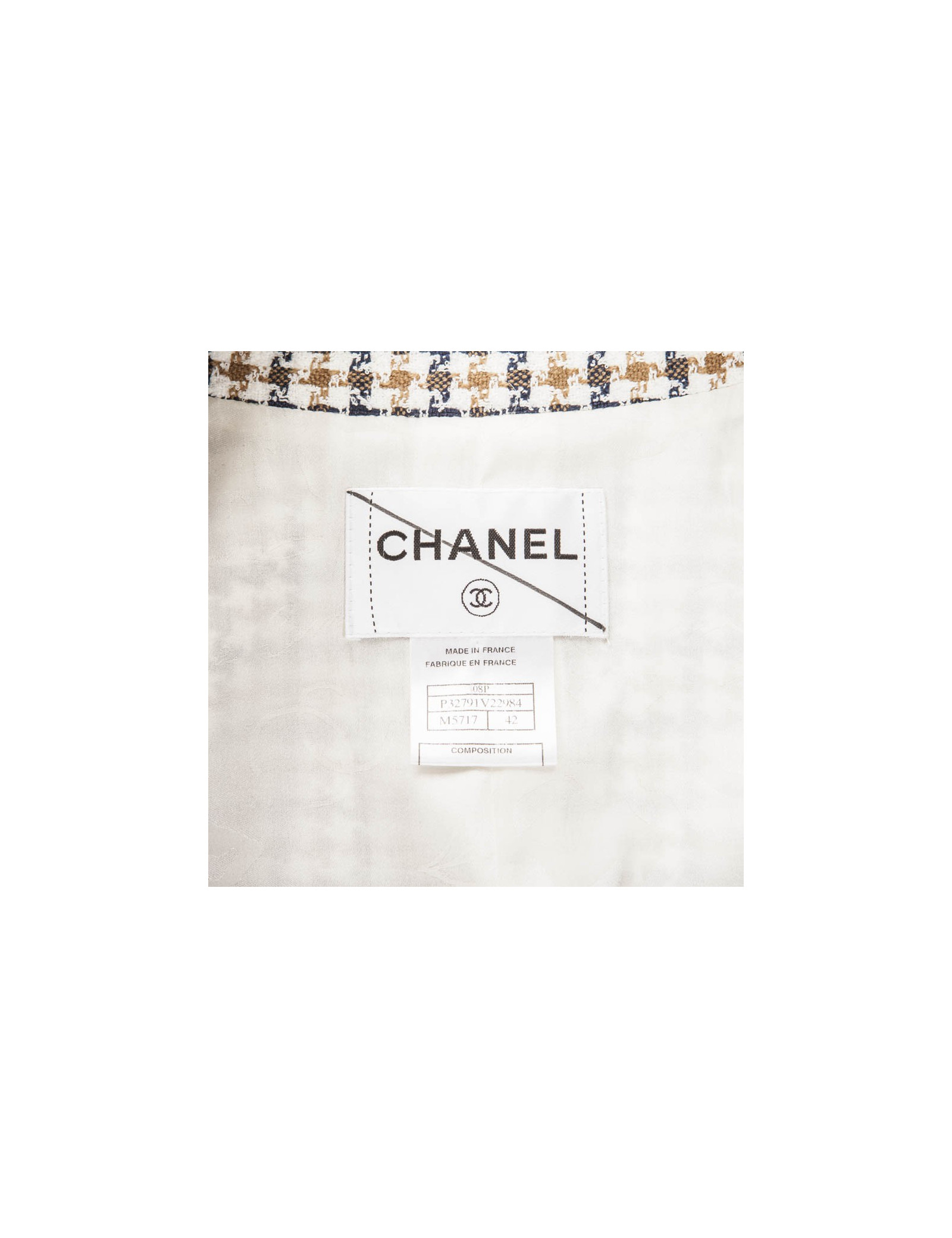 Ravissante veste CHANEL en tweed pied de poule beige et bleu se ferme à l'aide de 5 boutons en tweed et métal doré dissimulés à l'avant.