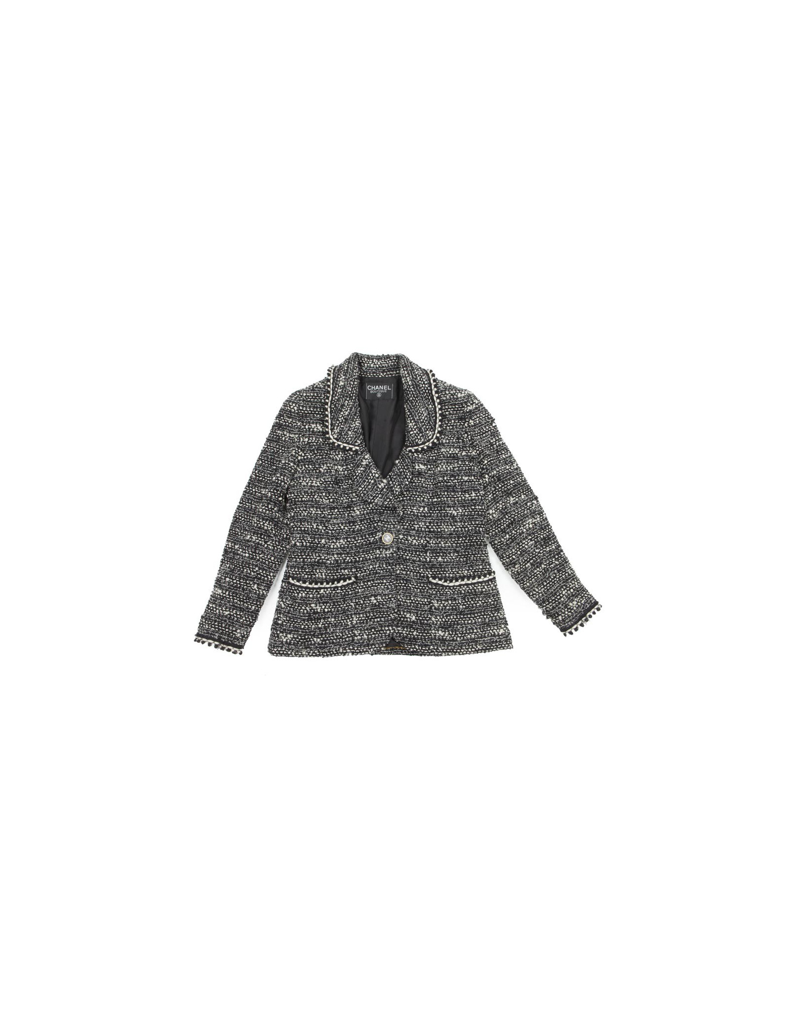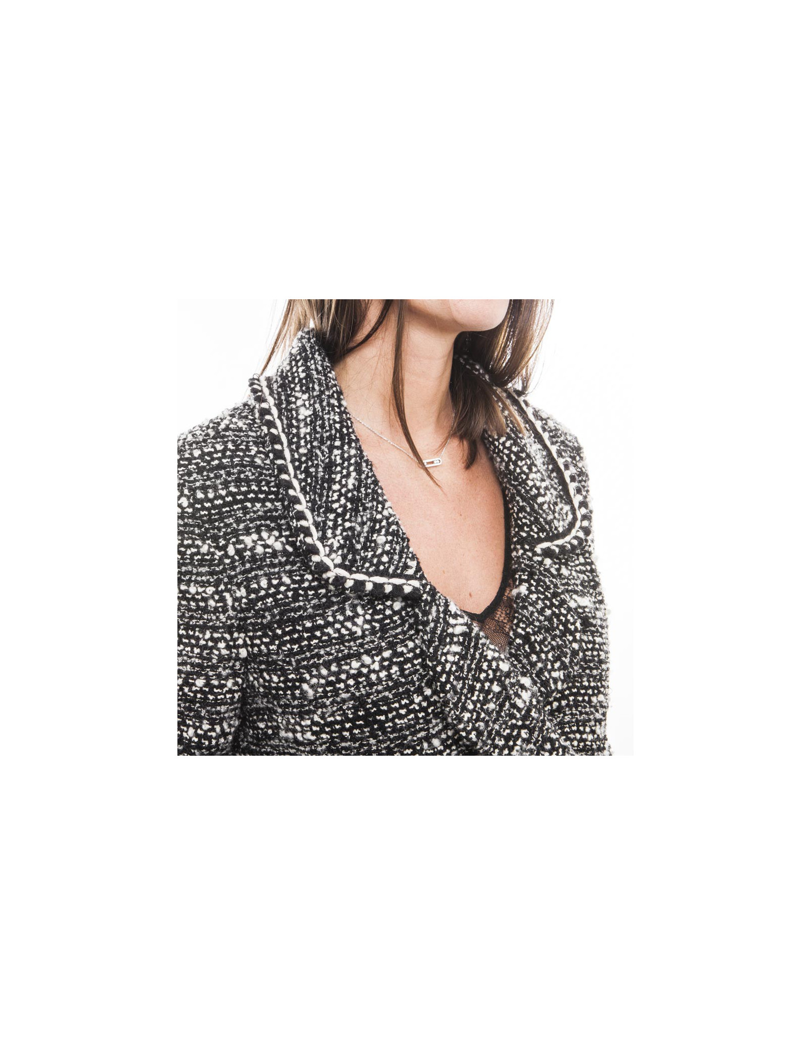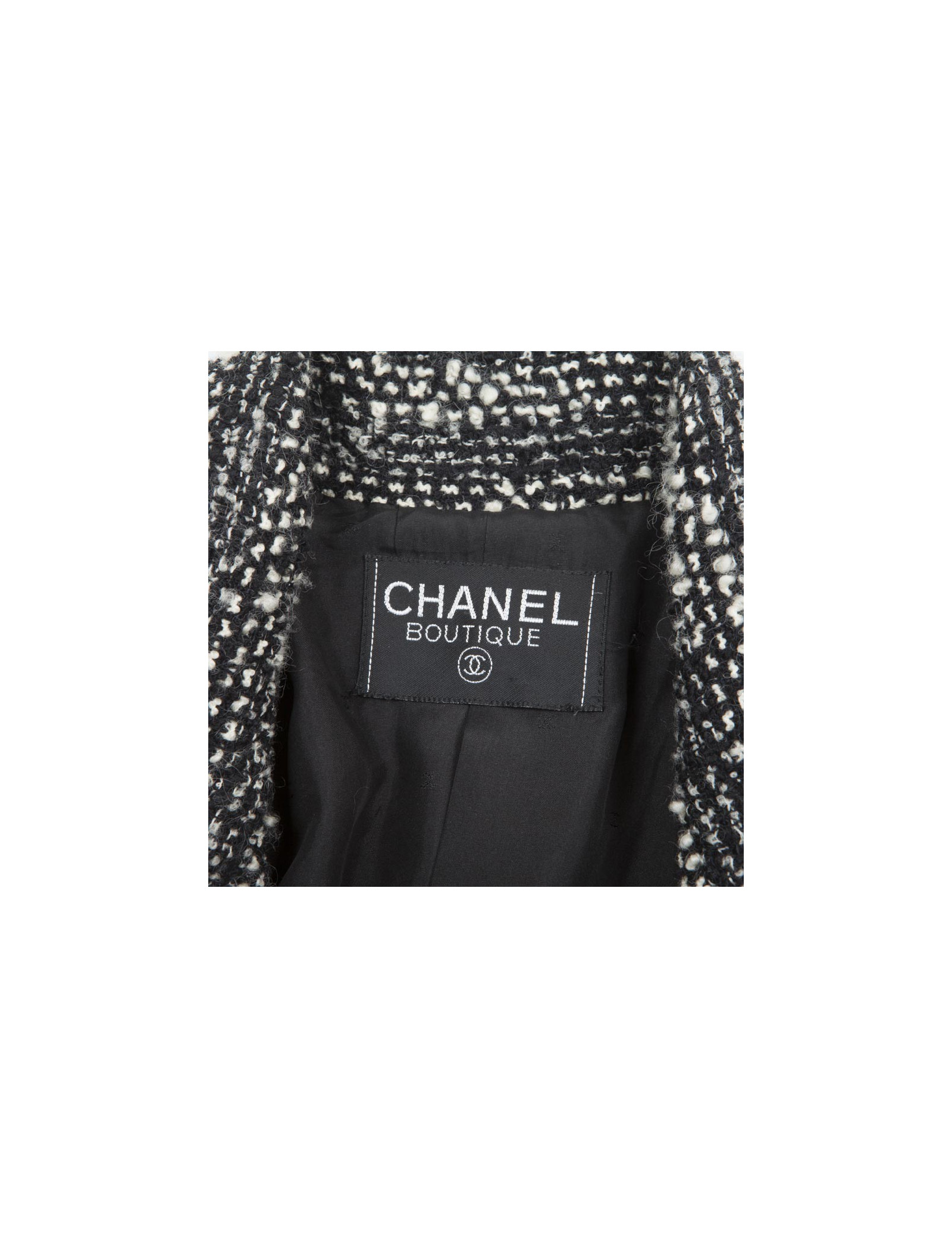 Veste Chanel en laine tweed chinée noir et blanc, taille 42/44 EU (absence d'étiquette de taille et de matière), fermée par un bouton noir siglé double "C" beige et doré vieilli (signé à l'arrière Chanel , deux poches plaquées bordées d'un galon de même couleur ainsi qu'au tour des manches. La doublure est en soie 100 % noire monogram.