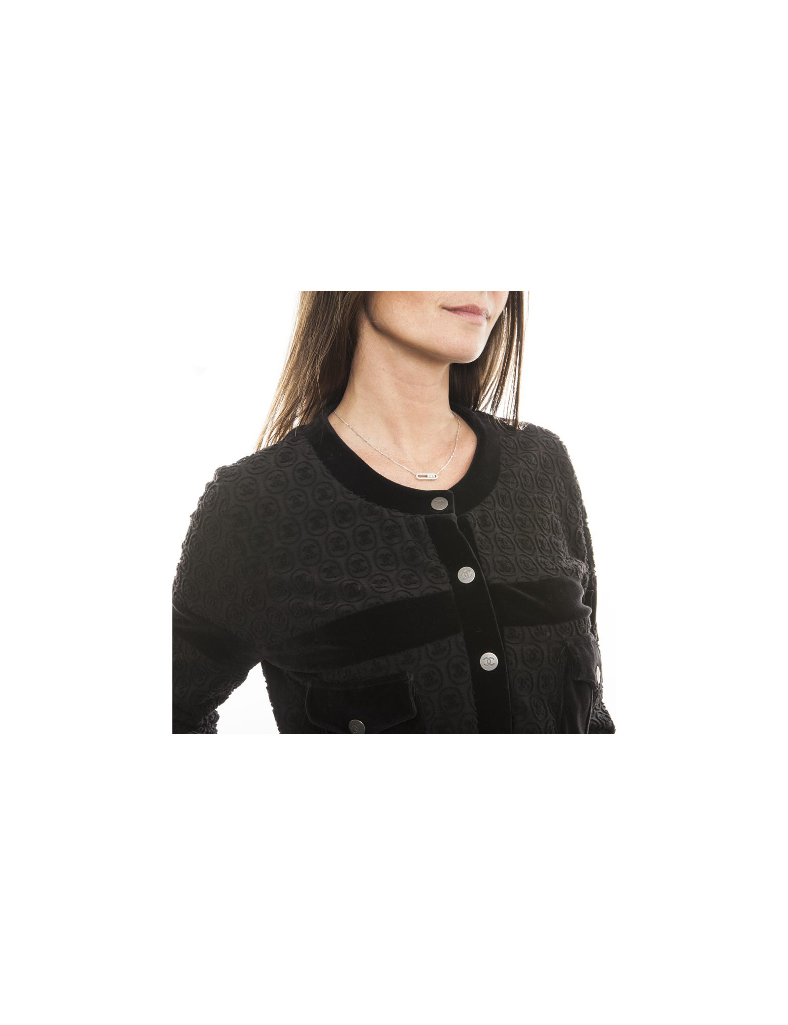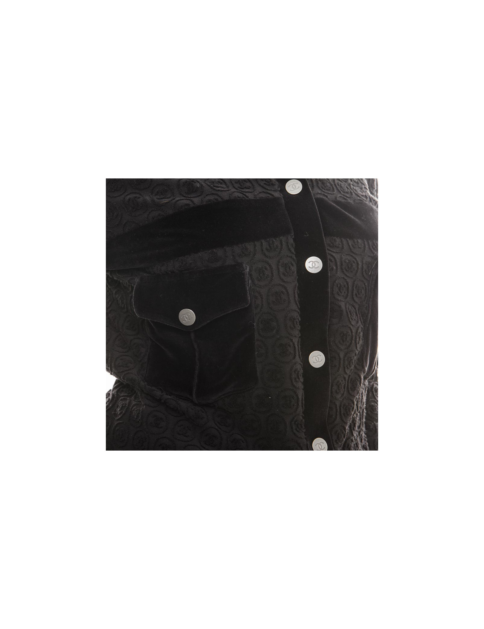 Blouson de la maison Chanel en coton noir siglé "CC". Fermeture par boutons pression "CC", avec deux petites poches au niveau de la poitrine (fermeture par pression) et est entièrement siglé "CC". Doublure en modal et coton noir.