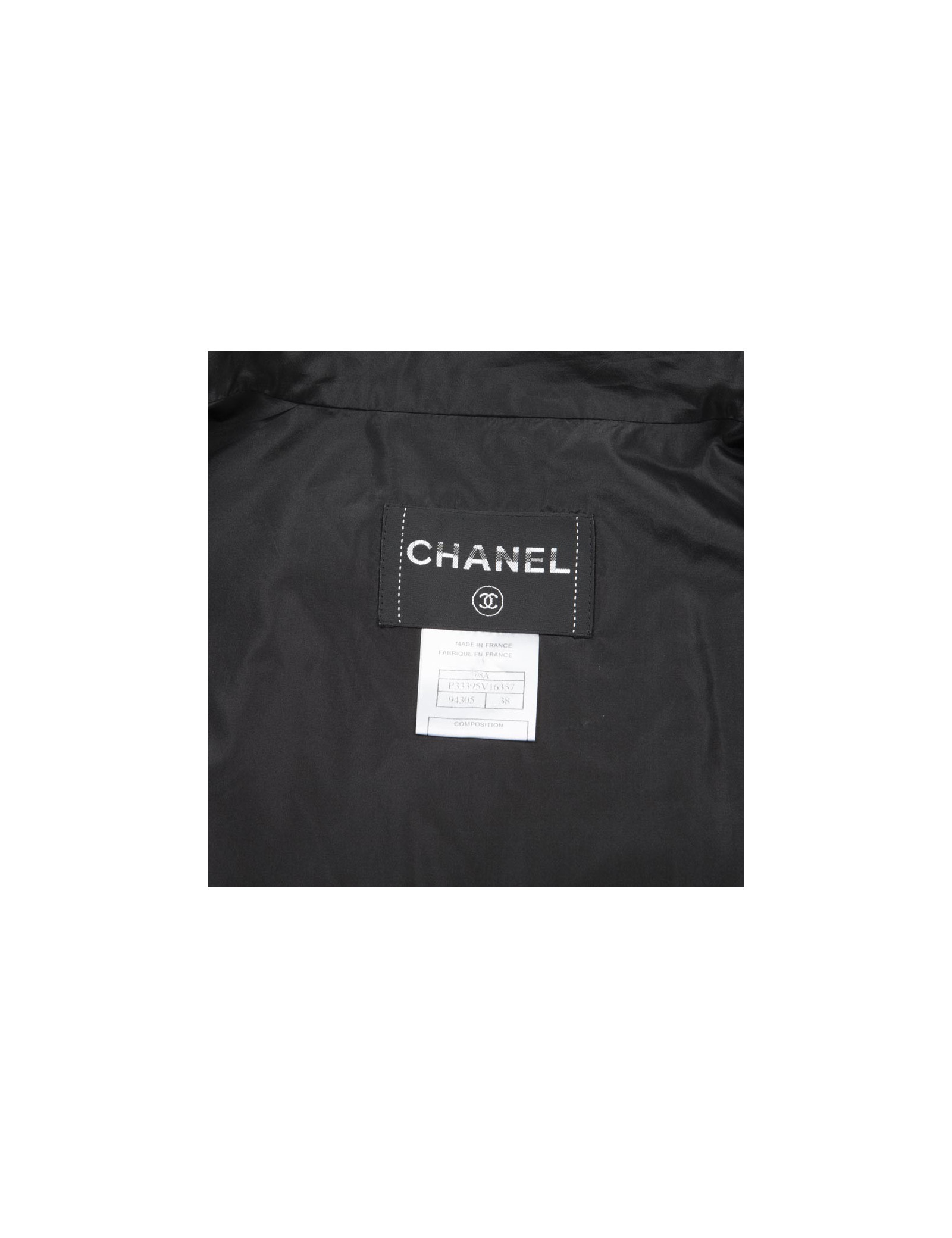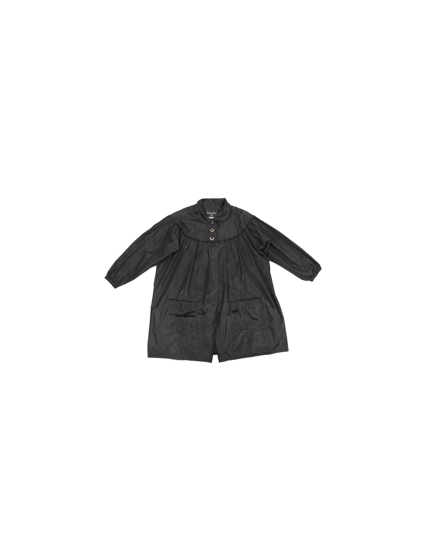 Veste longue de cocktail Chanel en soie noire. Collection Automne Hiver 2008. Se ferme avec une boutonnière au niveau du col, les boutons sont de forme carrée en métal argenté avec une pierre noire et un petit sigle "CC". Deux grandes poches non fermées et des bandes de détails sur les épaules, poches, le dos et le bas. Poignets serrés par élastique. Doublé dans la même matière, provient des soldes.